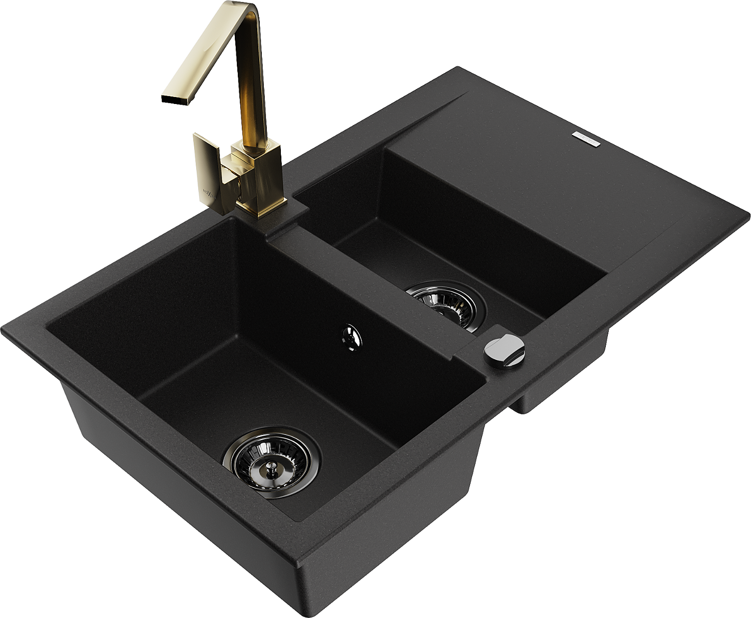 Mexen Gaspar 1,5 rekeszes gránit mosogató elvezetővel és Rita konyhai csapteleppel, fekete - 6507-77-670300-50-B