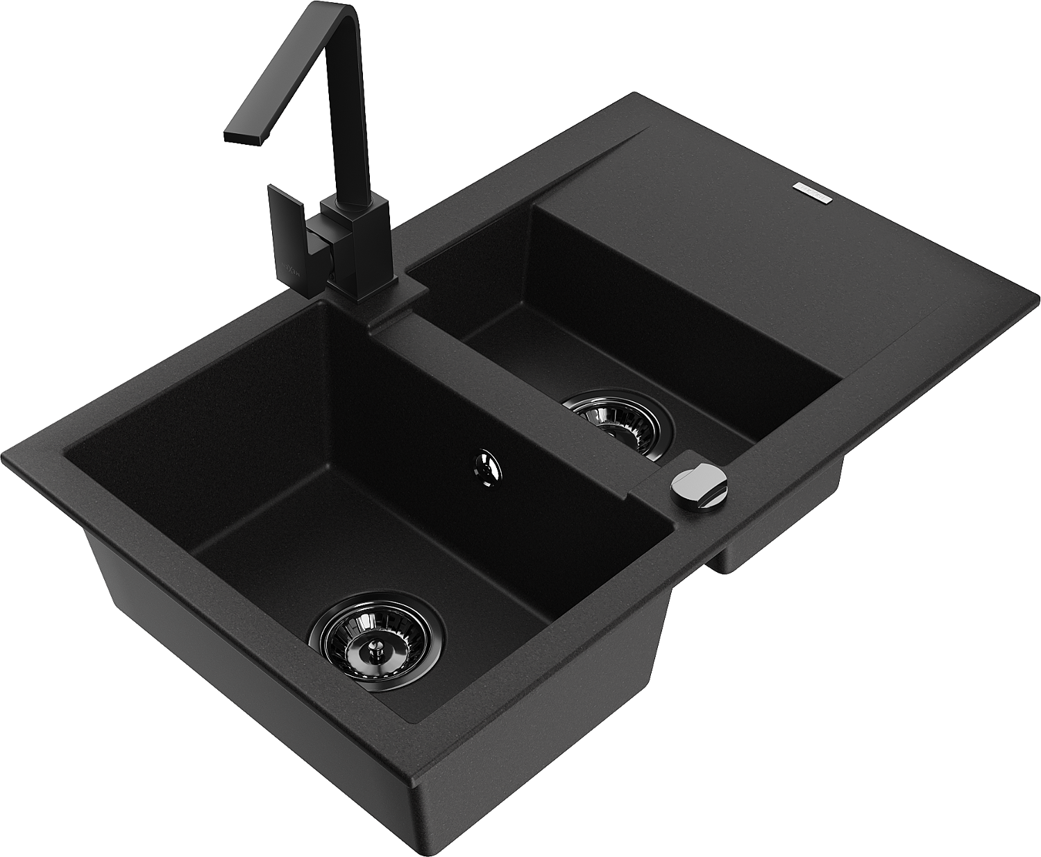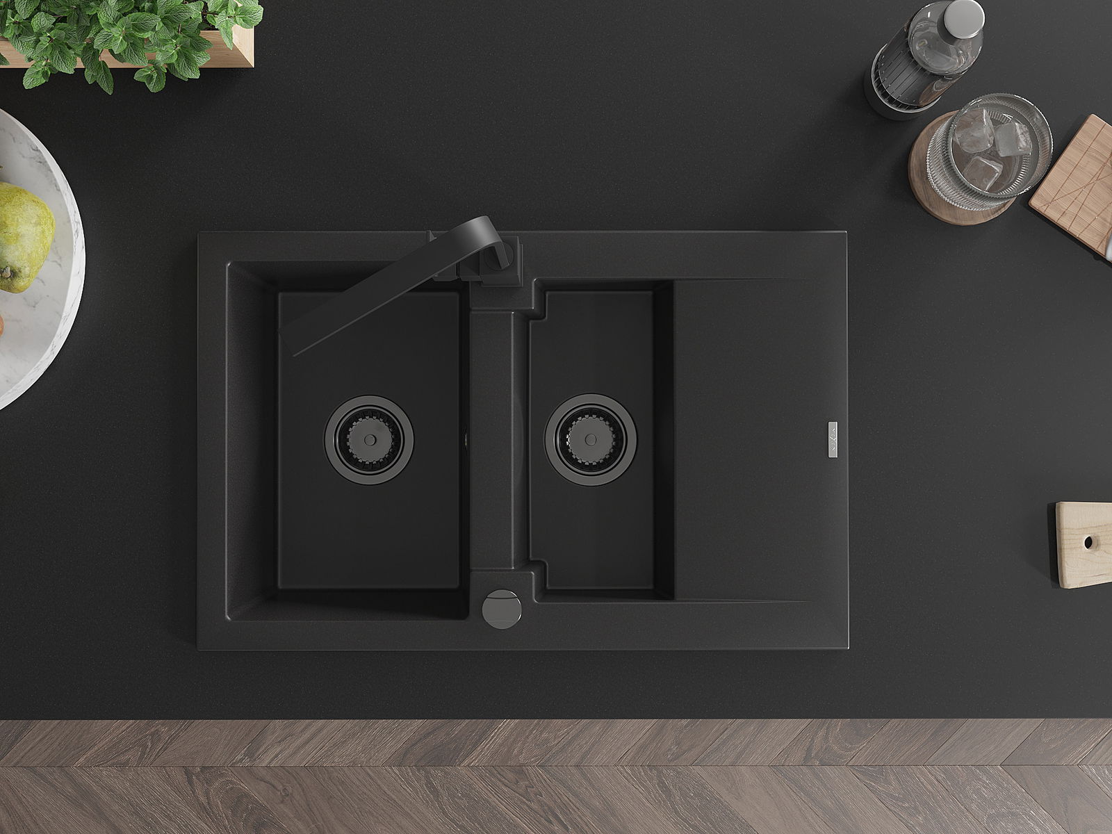 Mexen Gaspar 1,5 rekeszes gránit mosogató medence csepegtetővel és Rita konyhacsappal, fekete - 6507-77-670300-70-B