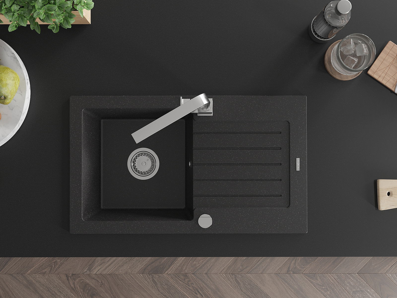 A mosogató magas minőségű gránitból készült. Elegáns, de mindenekelőtt praktikus kiegészítője minden konyhának, függetlenül annak stílusától. A gránit magas minősége és tartóssága hosszú távú használatot biztosít.