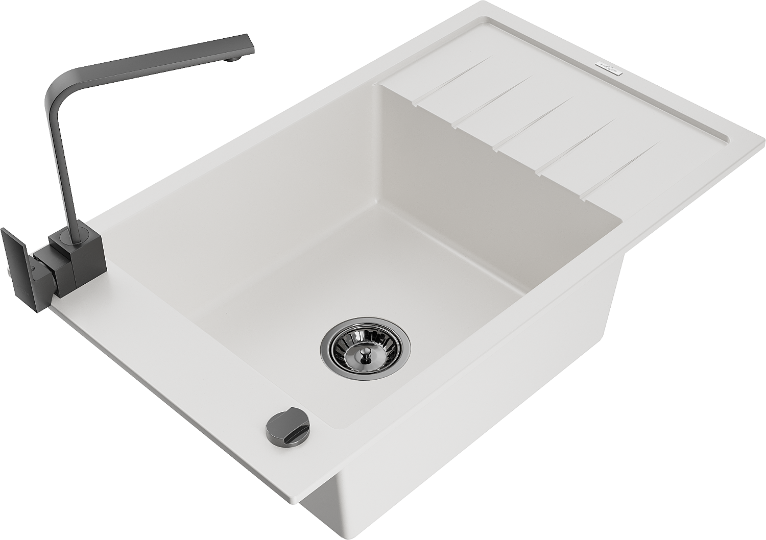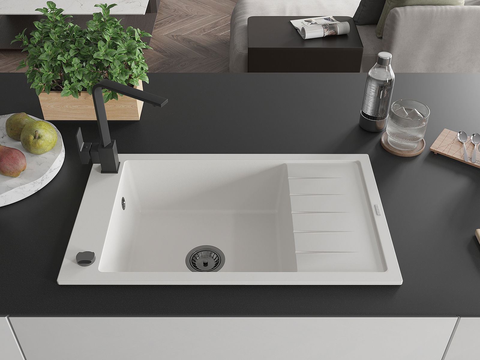 Mexen Elias gránit mosogató 1 medencével, csepegtetővel és Rita konyhai csapteleppel, fehér - 6511-20-670300-70