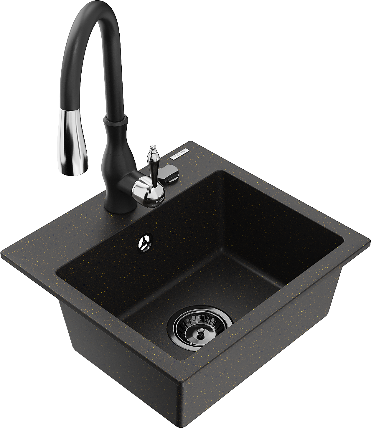 Mexen Milo egykamrás gránit mosogató Savita konyhai csapteleppel, fekete/arany metál - 6505-75-672601-70-B