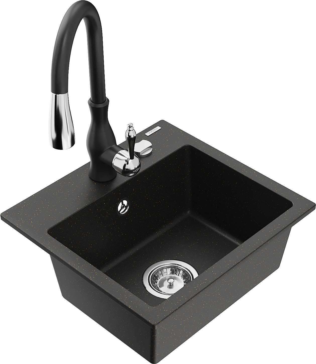 Mexen Milo gránit egymedencés mosogató Savita konyhai csappal, fekete/arany metál - 6505-75-672601-70