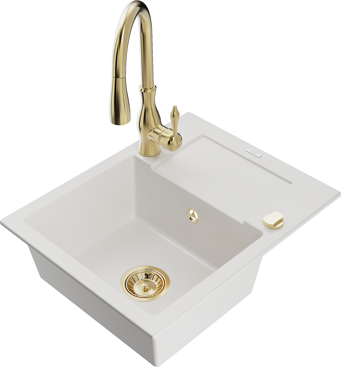 Mexen Enzo egymedencés gránit mosogató csepegtető tálcával és Savita konyhai csapteleppel, fehér - 6506-20-672601-50