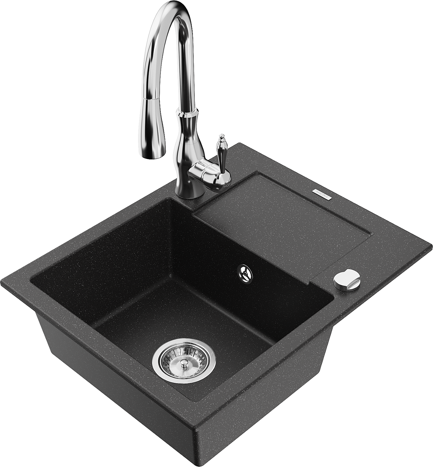 Mexen Enzo gránit mosogató 1-medencés csepegtetővel és Savita konyhai csapteleppel, fekete/ezüst metál - 6506-73-672601-00