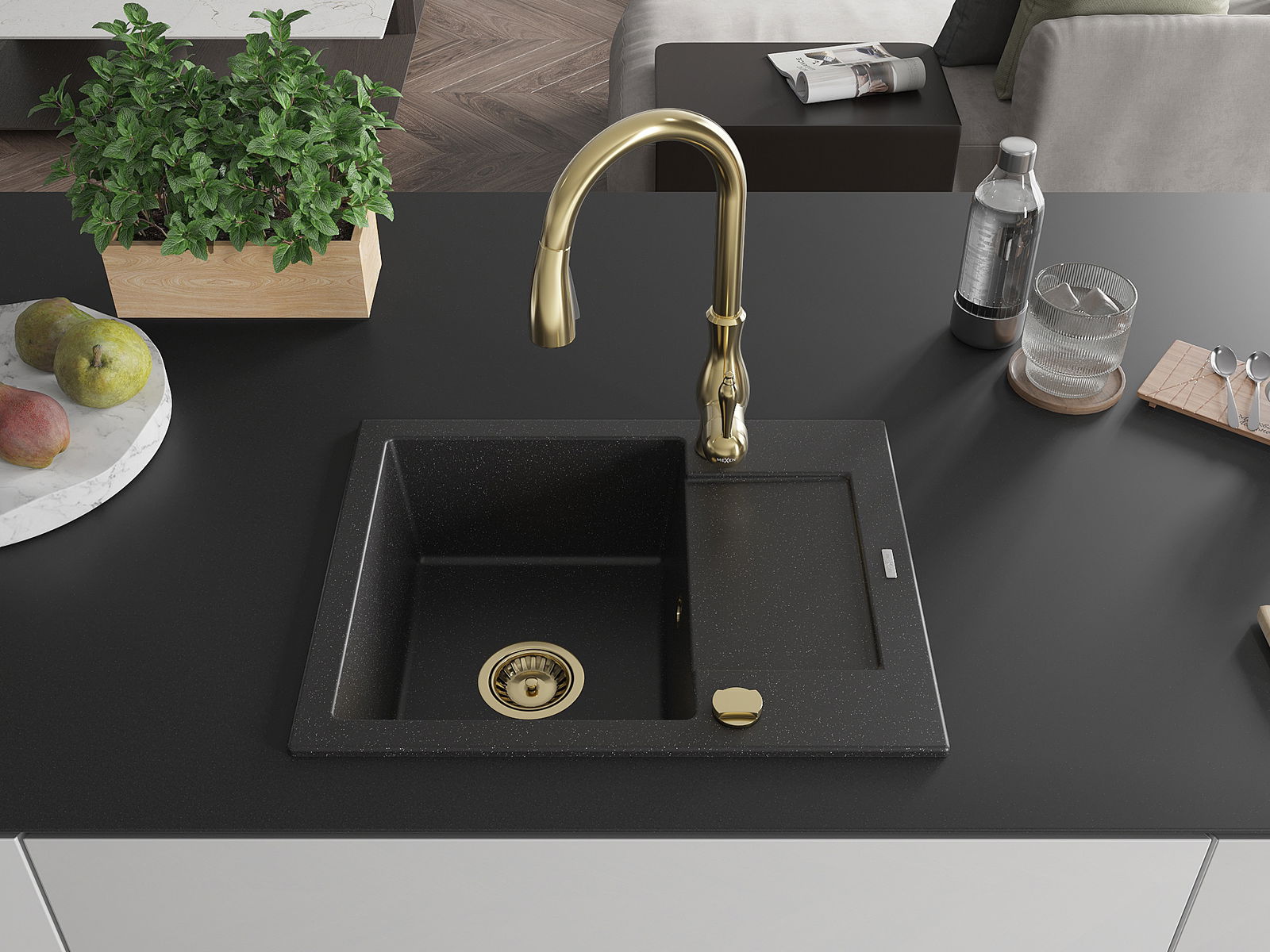 A mosogató kiváló minőségű gránitból készül. Ez egy elegáns és mindenekelőtt minden konyhához praktikus kiegészítés, stílusától függetlenül. A kiváló minőségű és a gránit tartósság biztosítja a sok éves használatát.