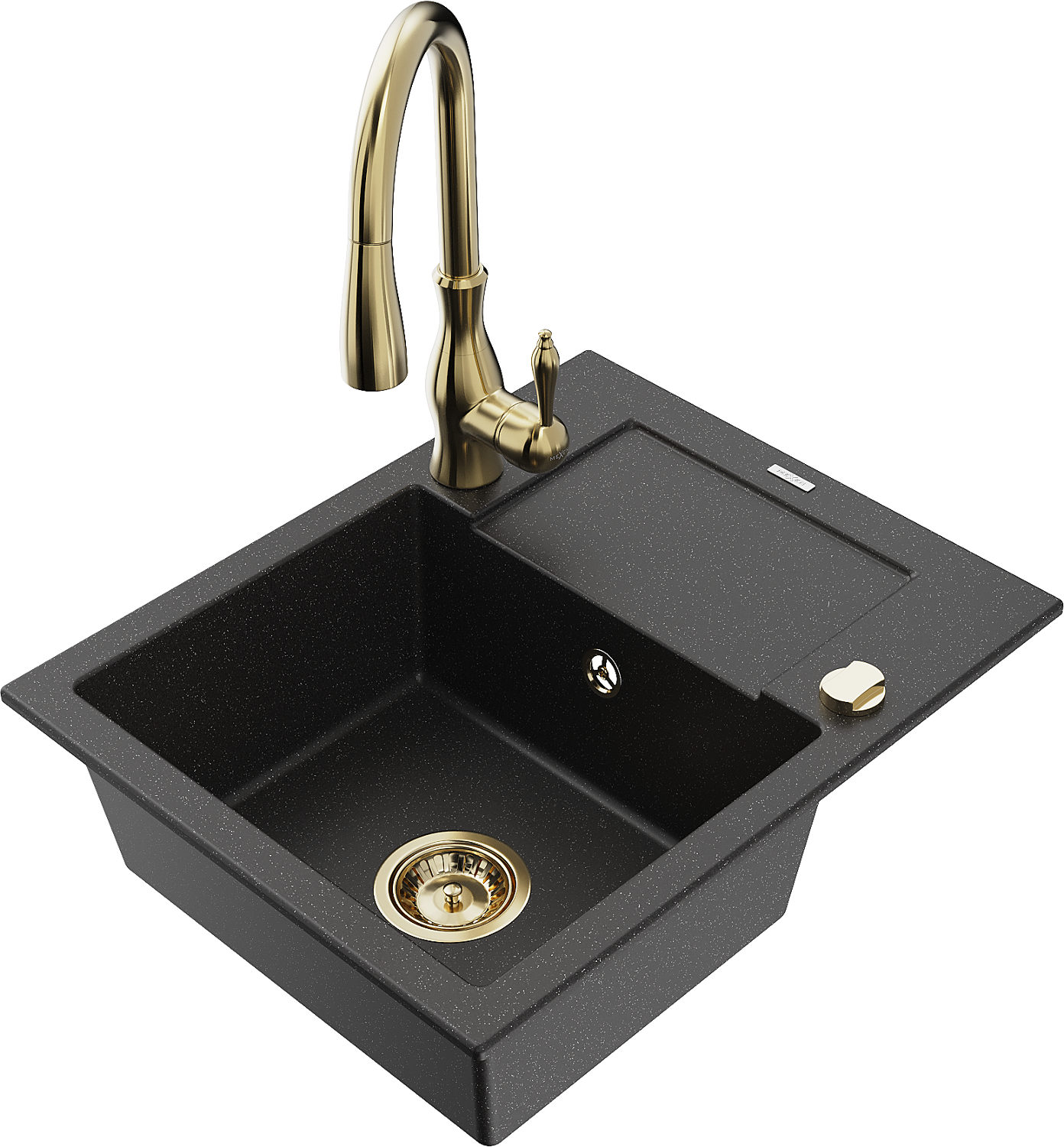 Mexen Enzo 1 rekeszes, csepegtetős gránit mosogató, Savita konyhai csappal, fekete/ezüst metál - 6506-73-672601-50