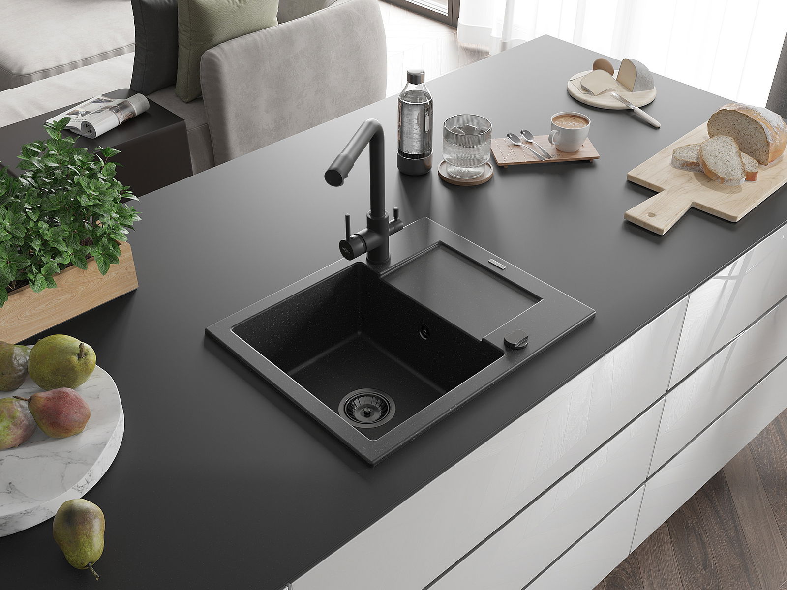 A mosogató kiváló minőségű gránitból készül. Ez egy elegáns és mindenekelőtt minden konyhához praktikus kiegészítés, stílusától függetlenül. A kiváló minőségű és a gránit tartósság biztosítja a sok éves használatát.