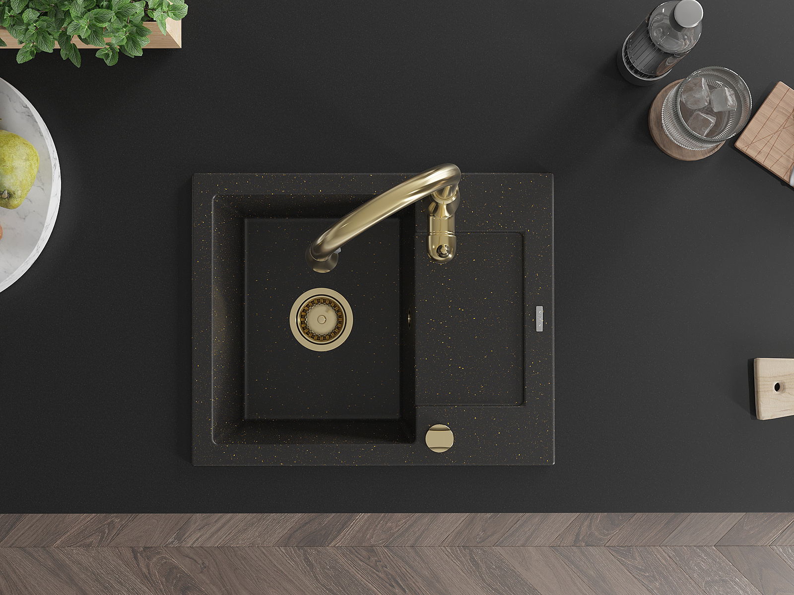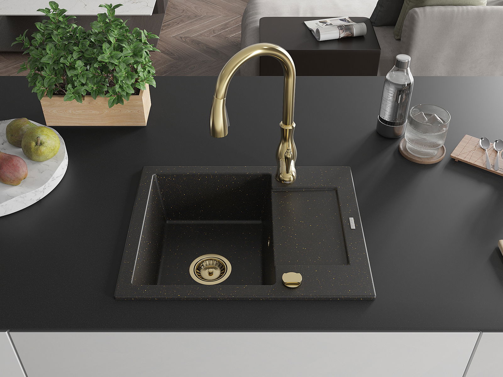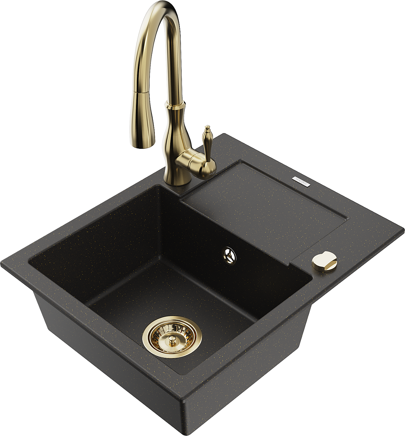 Mexen Enzo gránit mosogató 1-medencés csepegtetővel és Savita konyhai csappal, fekete/arany metál - 6506-75-672601-50