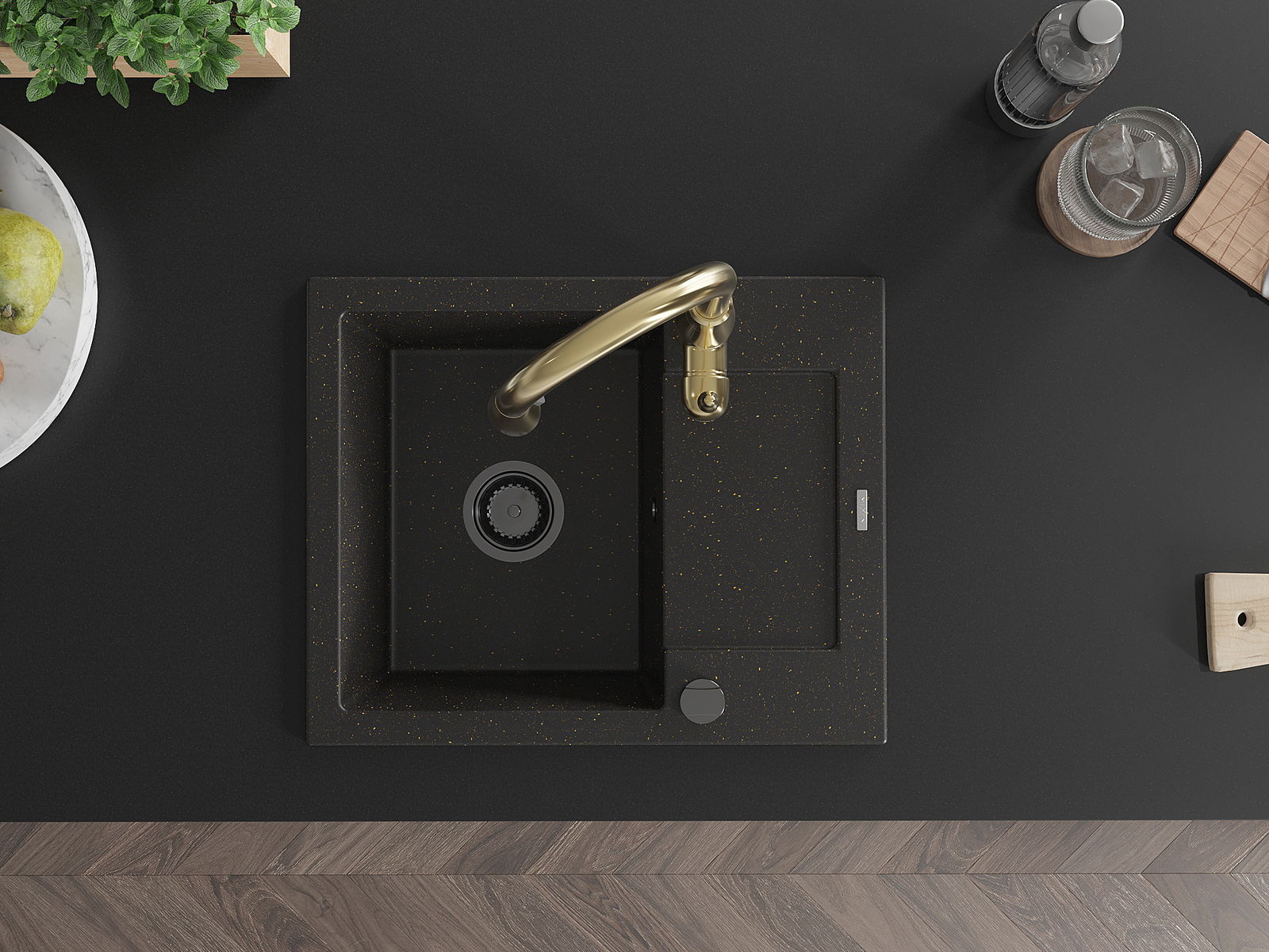 Mexen Enzo 1-medencés gránit mosogató csepegtetővel és Savita konyhai csapteleppel, fekete/arany metál - 6506-75-672601-50-B