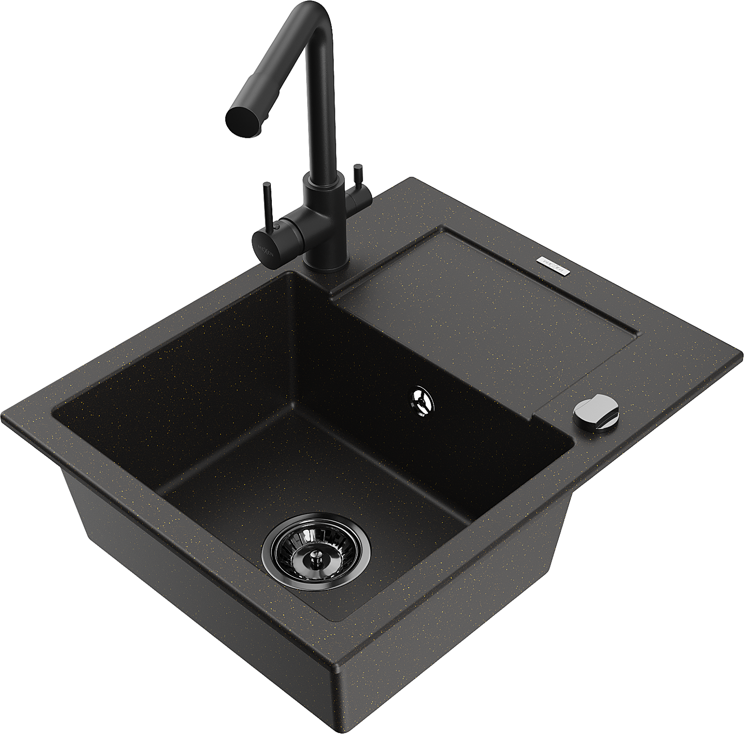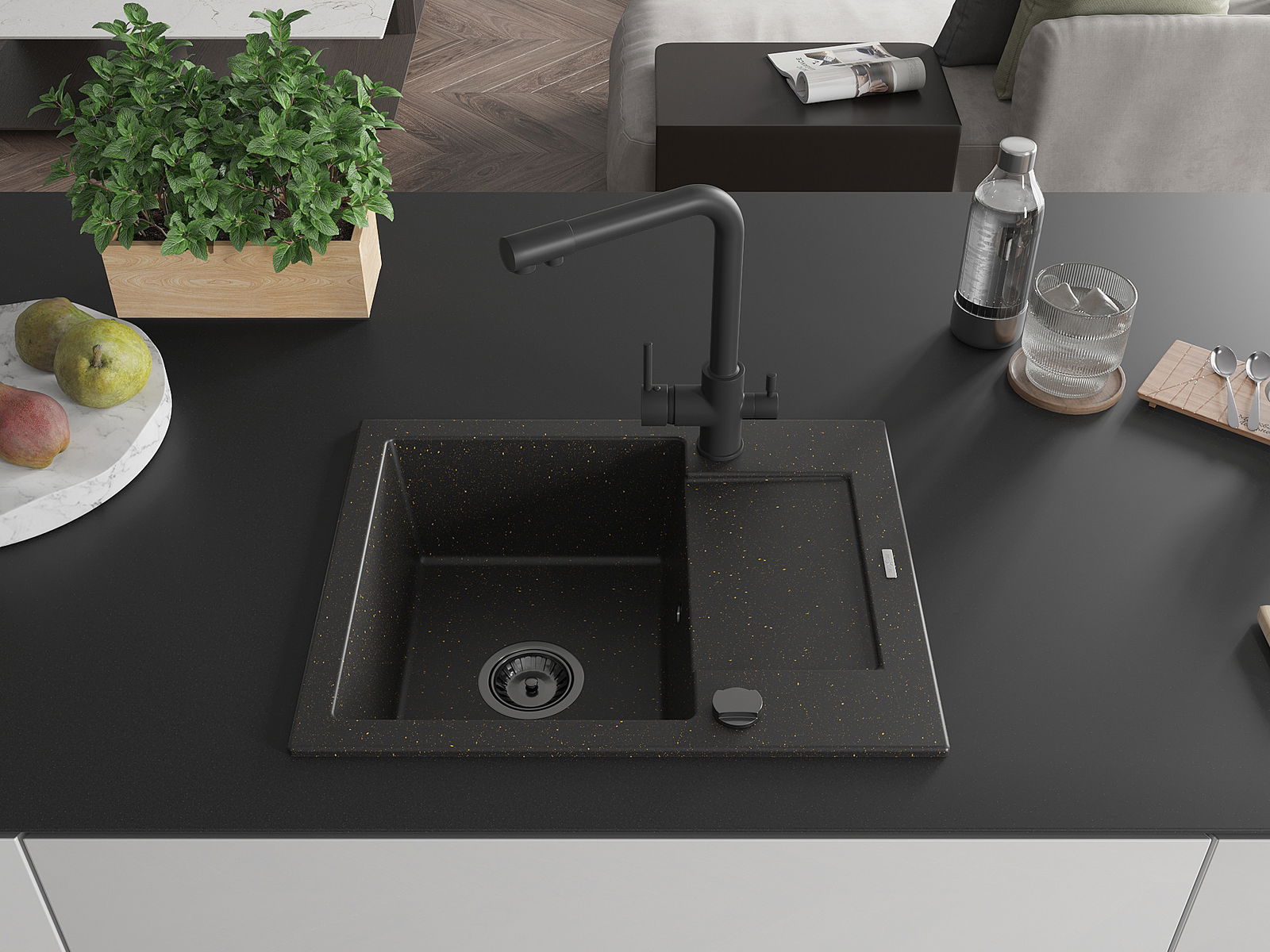 Mexen Enzo 1-medencés gránit mosogató lefolyótálcával és Duero konyhai csapteleppel, fekete/arany metál - 6506-75-671600-70-B