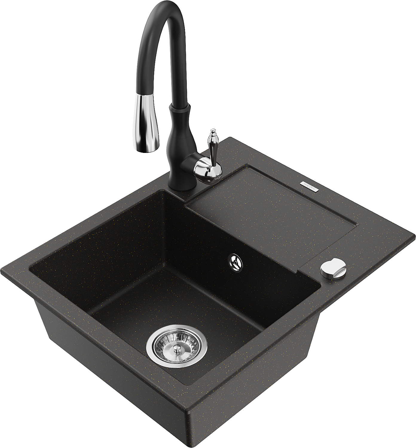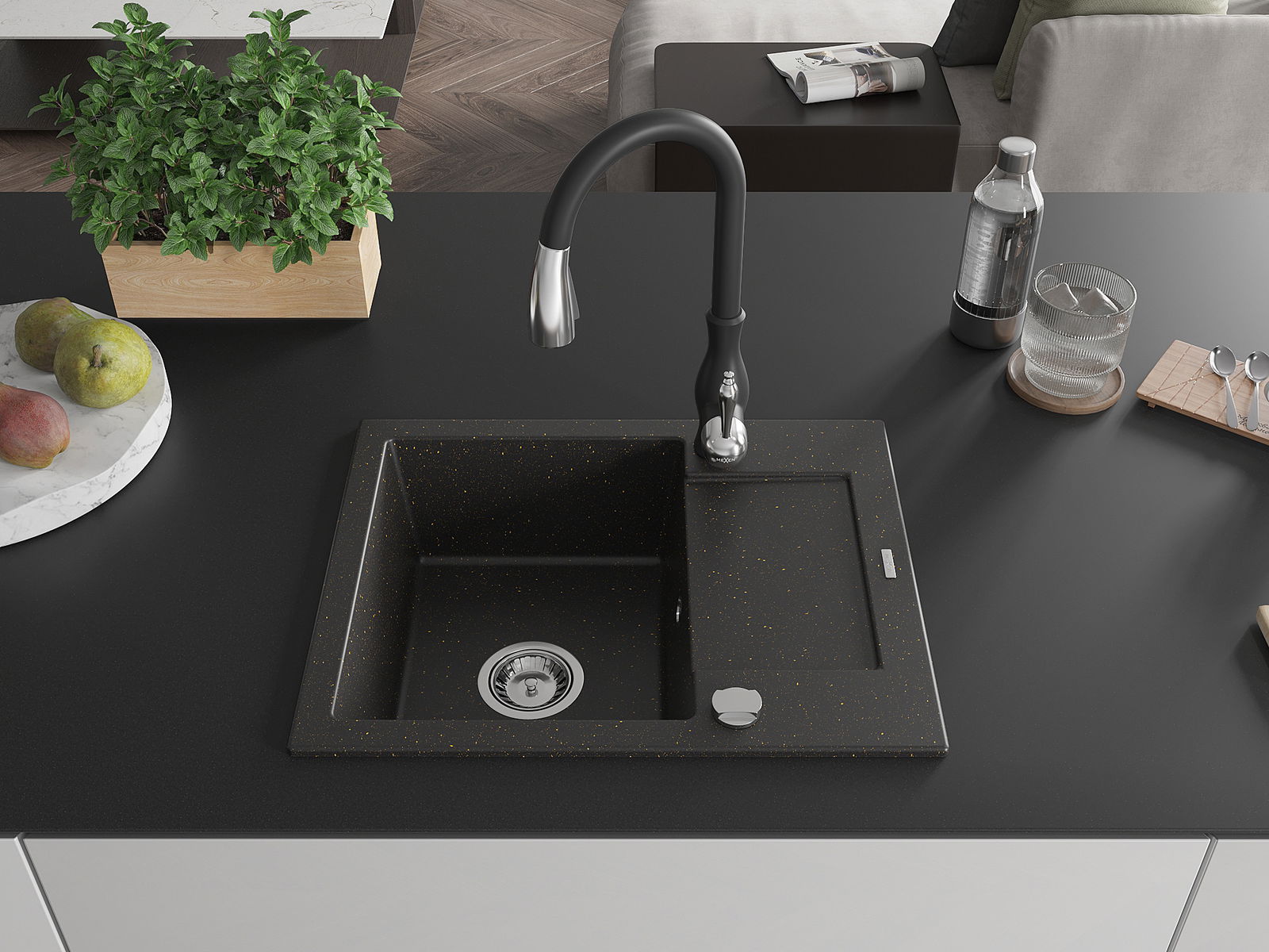 Mexen Enzo egymedencés gránit mosogató csepegtetővel és Savita konyhai csappal, fekete/arany metál - 6506-75-672601-70