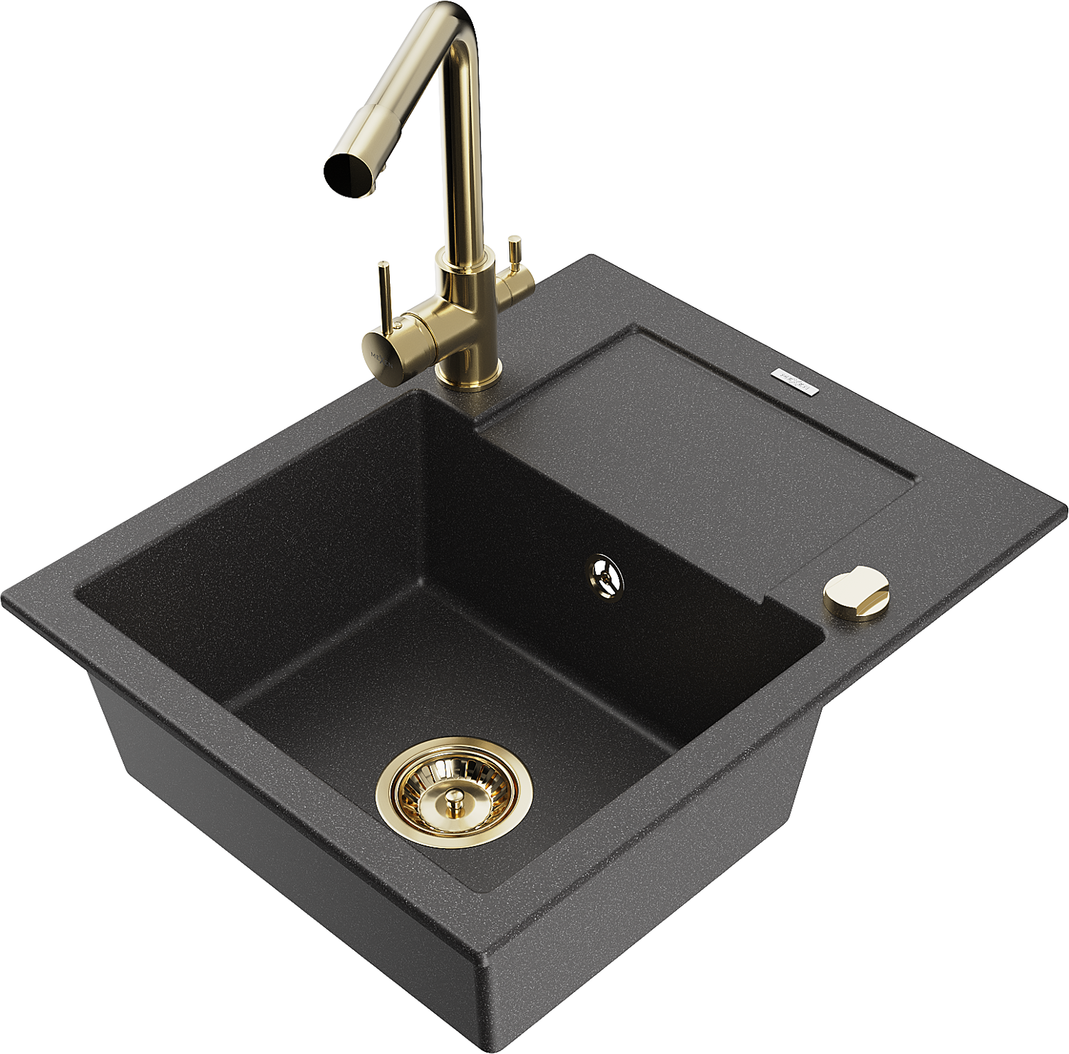 Mexen Enzo kőgránit mosogató 1-medencés csepegtetővel és konyhai csappal Duero, fekete pettyes - 6506-76-671600-50