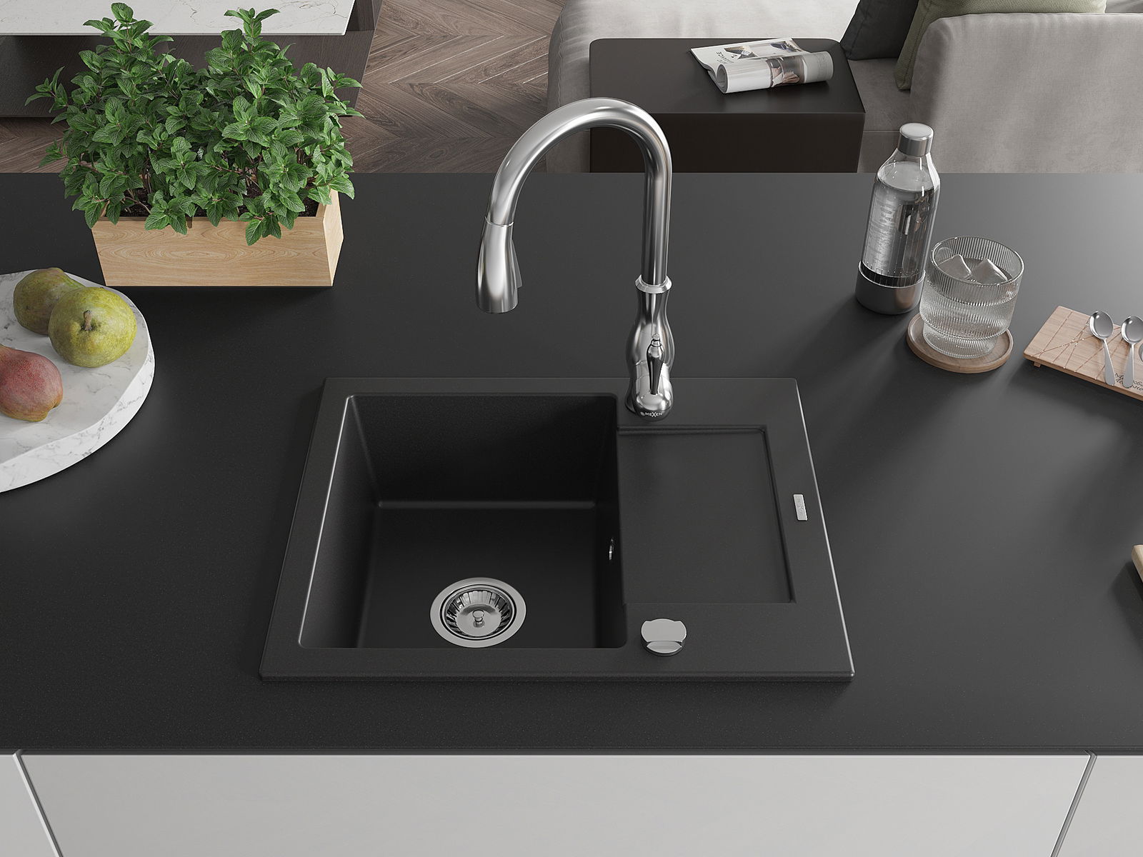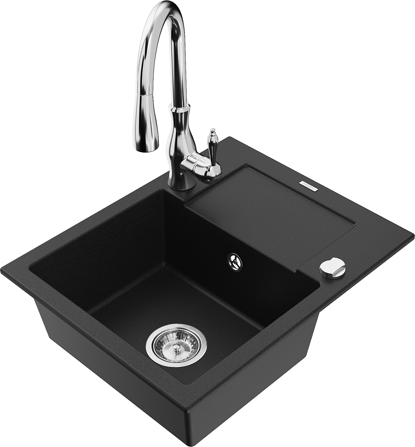 Mexen Enzo gránit egytálcás mosogató csepegtetőtálcával és Savita konyhai csappal, fekete - 6506-77-672601-00