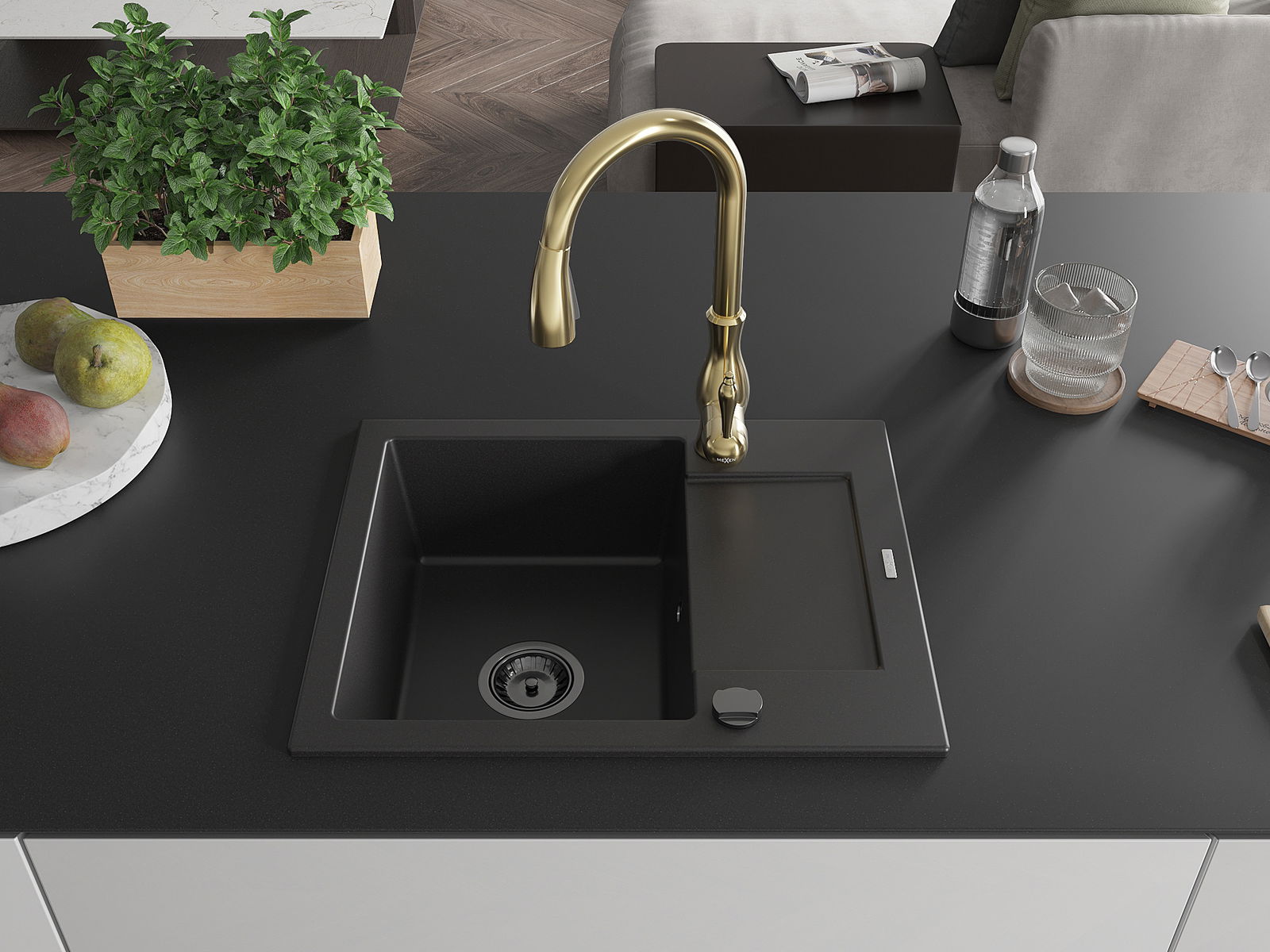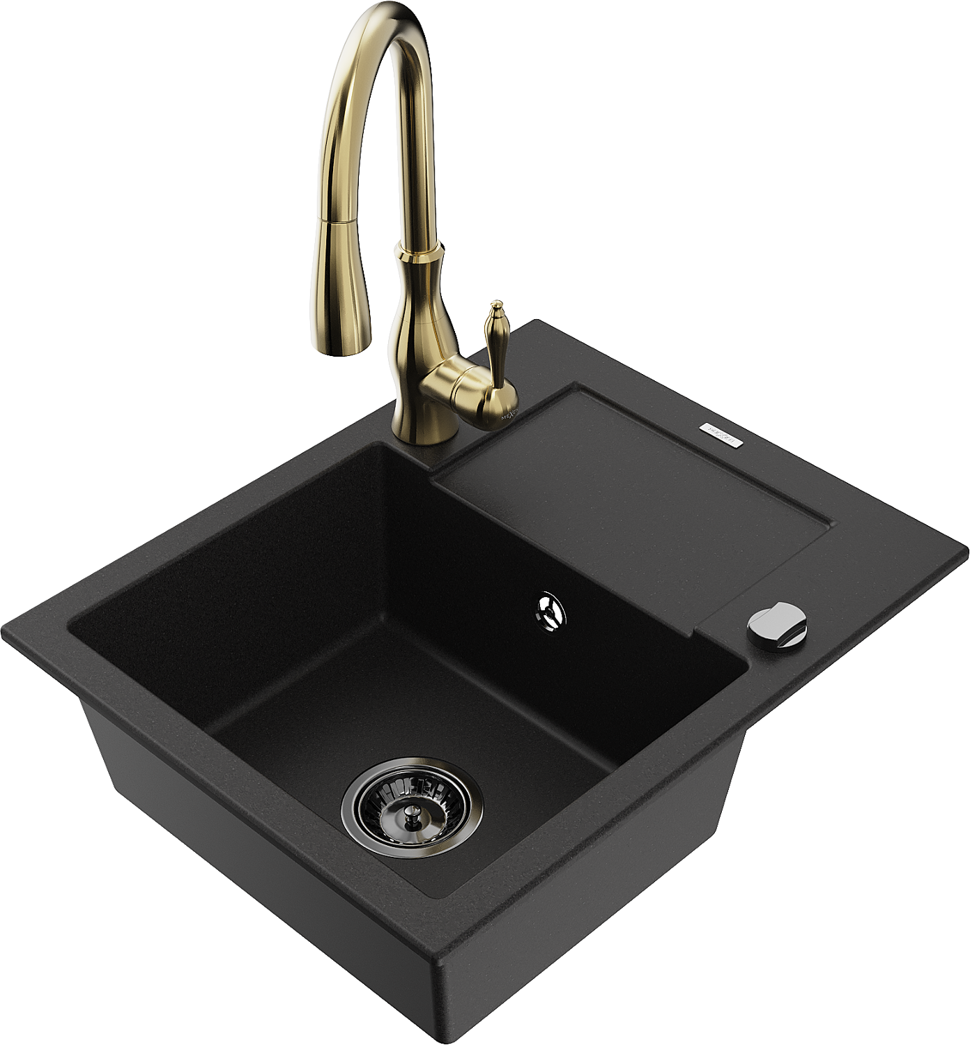 Mexen Enzo gránit egymedencés mosogató csepptálcával és Savita konyhai csapteleppel, fekete - 6506-77-672601-50-B