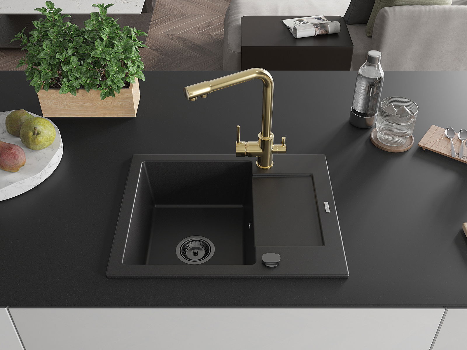 A mosogató magas minőségű gránitból készült. Elegáns, de mindenekelőtt praktikus kiegészítője minden konyhának, függetlenül annak stílusától. A gránit magas minősége és tartóssága hosszú távú használatot biztosít.