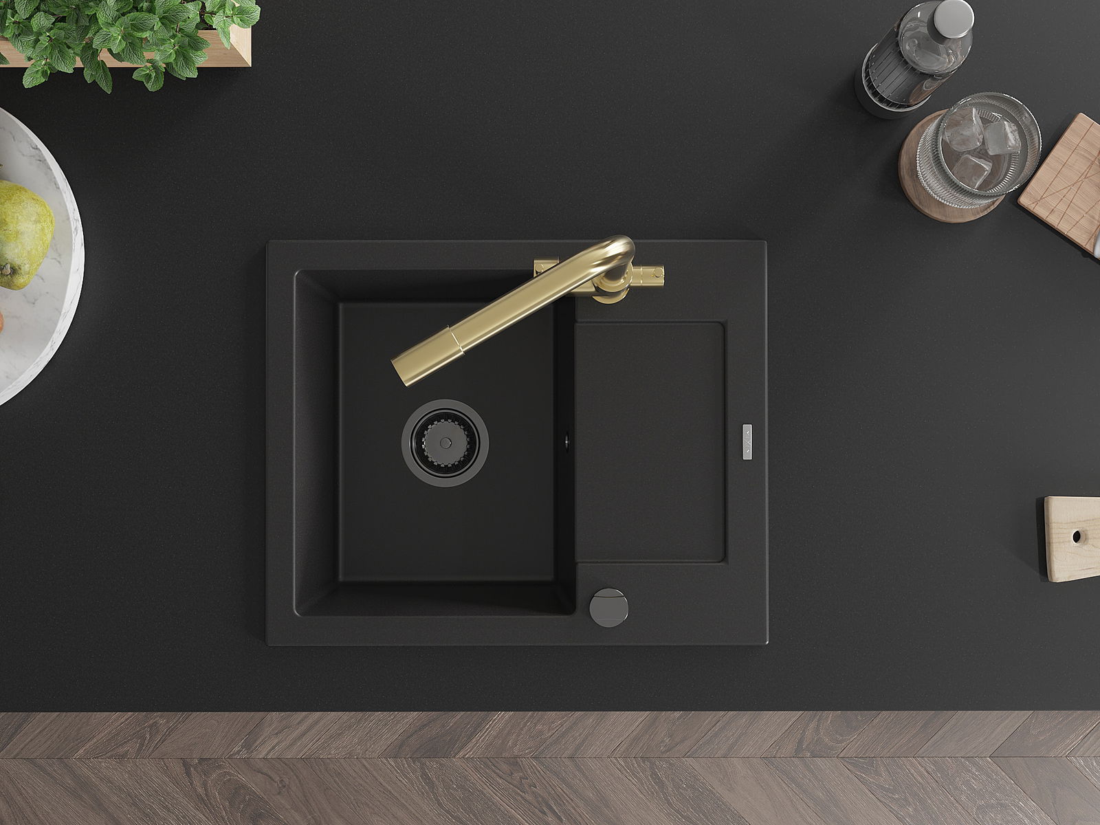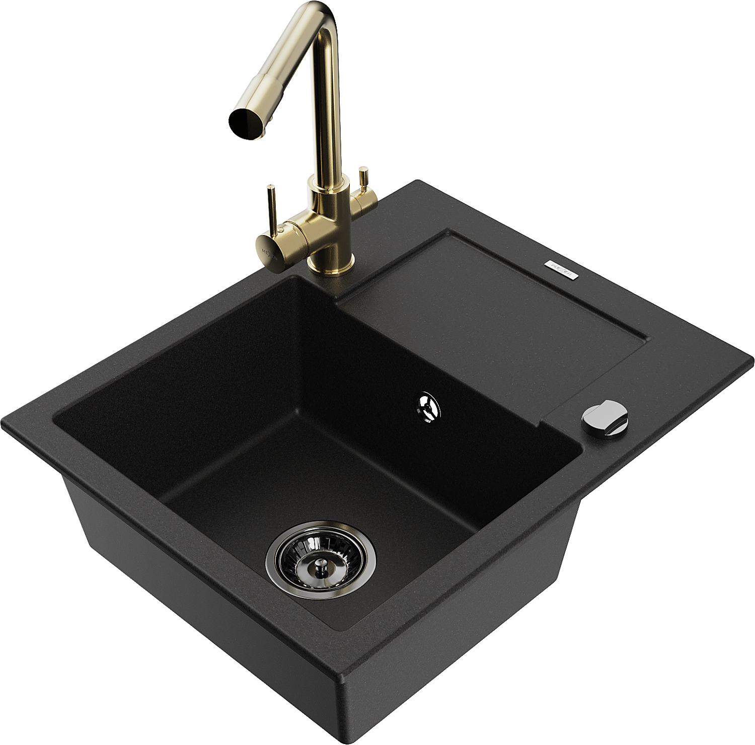 Mexen Enzo gránit mosogató, 1-medencés csepegtetővel és Duero konyhai csappal, fekete - 6506-77-671600-50-B