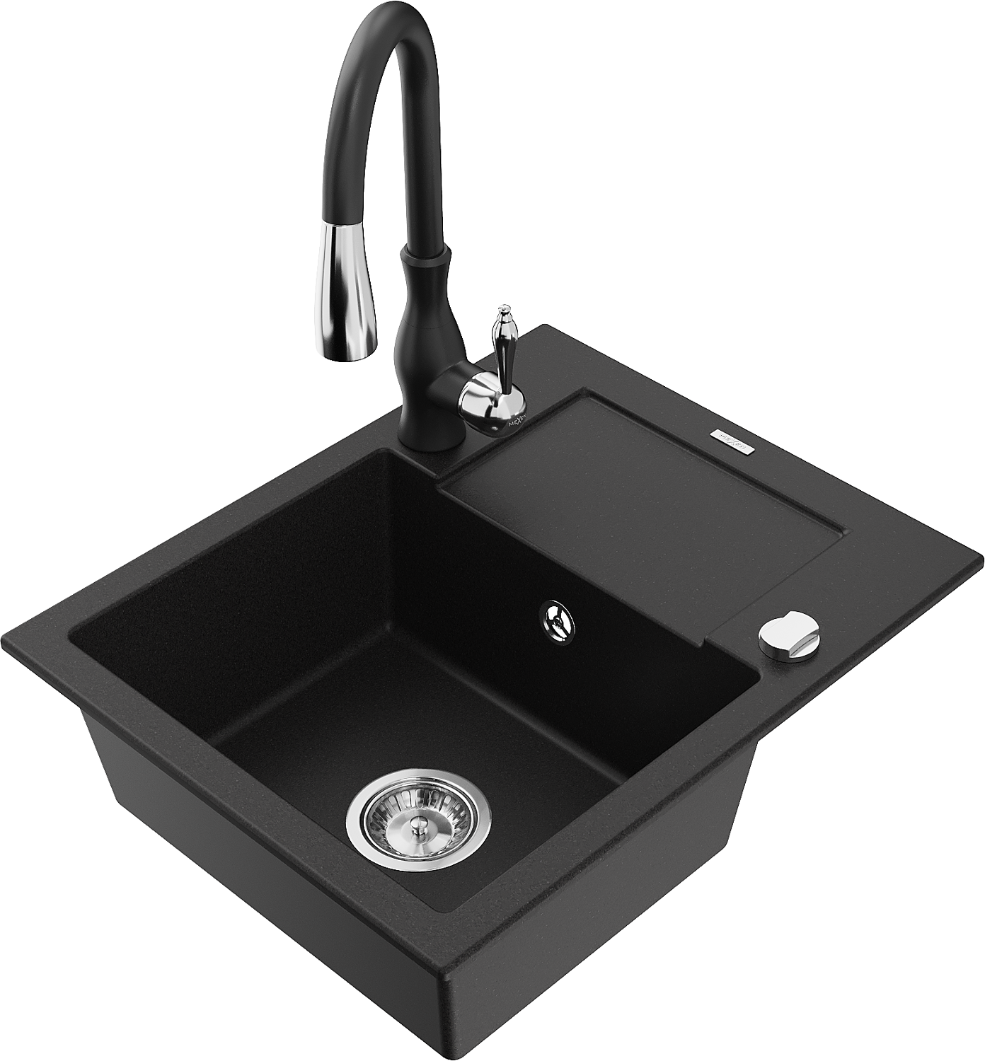 Mexen Enzo egymedencés gránit mosogató csepegtetővel és Savita konyhai csapteleppel, fekete - 6506-77-672601-70