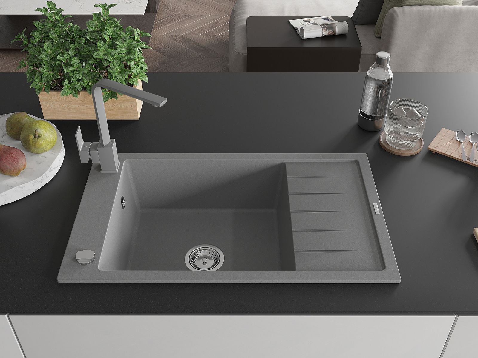 A mosogató kiváló minőségű gránitból készül. Ez egy elegáns és mindenekelőtt minden konyhához praktikus kiegészítés, stílusától függetlenül. A kiváló minőségű és a gránit tartósság biztosítja a sok éves használatát.