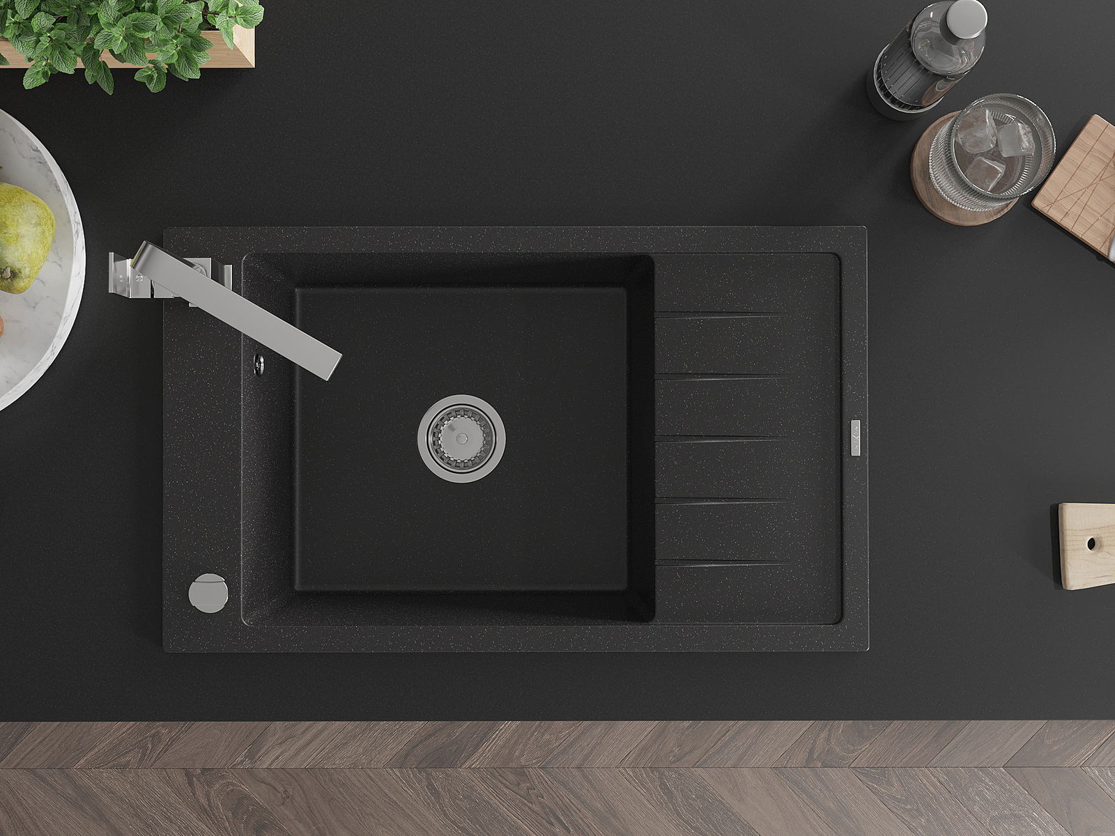 A mosogató kiváló minőségű gránitból készül. Ez egy elegáns és mindenekelőtt minden konyhához praktikus kiegészítés, stílusától függetlenül. A kiváló minőségű és a gránit tartósság biztosítja a sok éves használatát.
