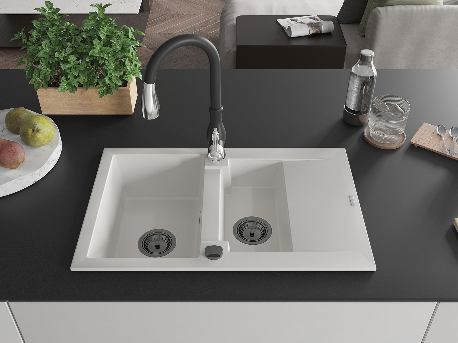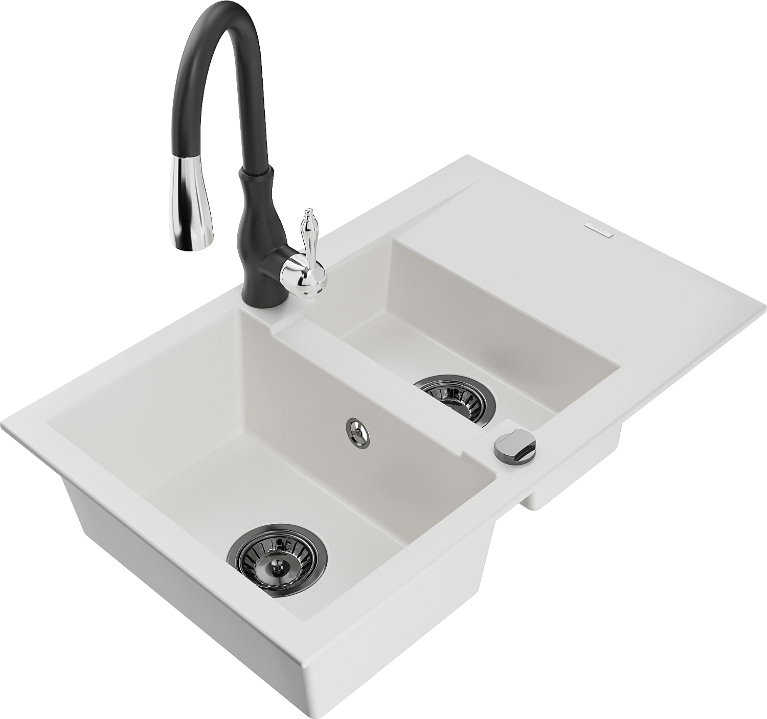 Mexen Gaspar gránit mosogató 1,5 rekeszes csepegtetővel és Savita konyhai csappal, fehér - 6507-20-672601-70