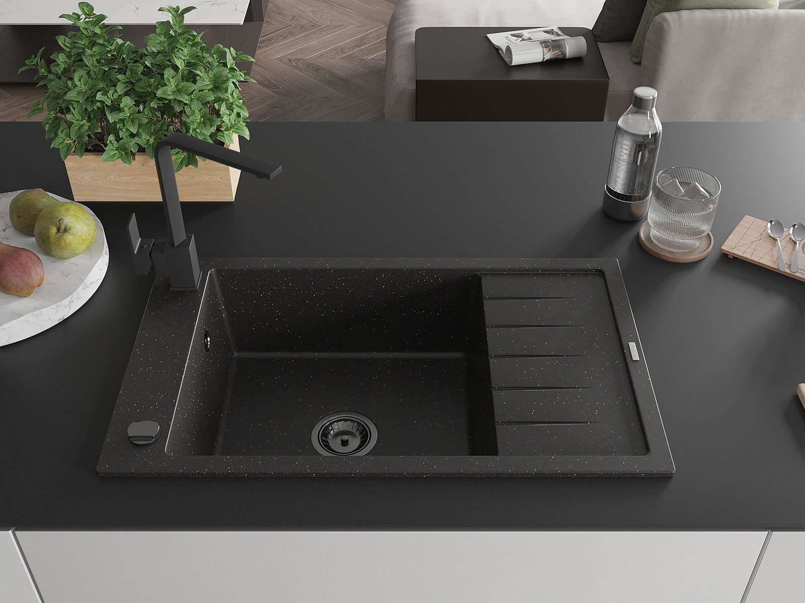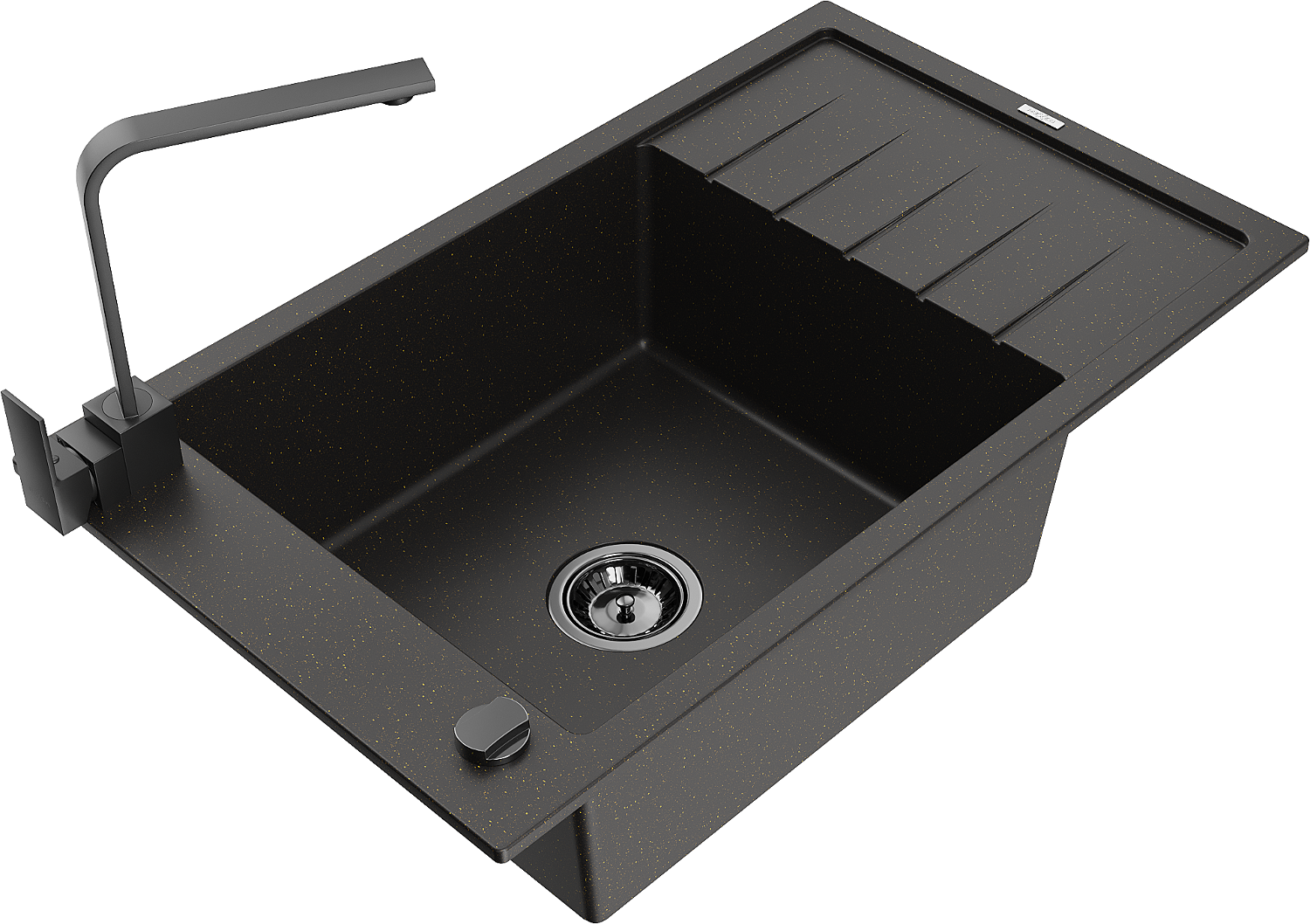 Mexen Elias egymedencés gránit mosogató csepegtetővel és Rita konyhai csapteleppel, fekete/arany metál - 6511-75-670300-70-B