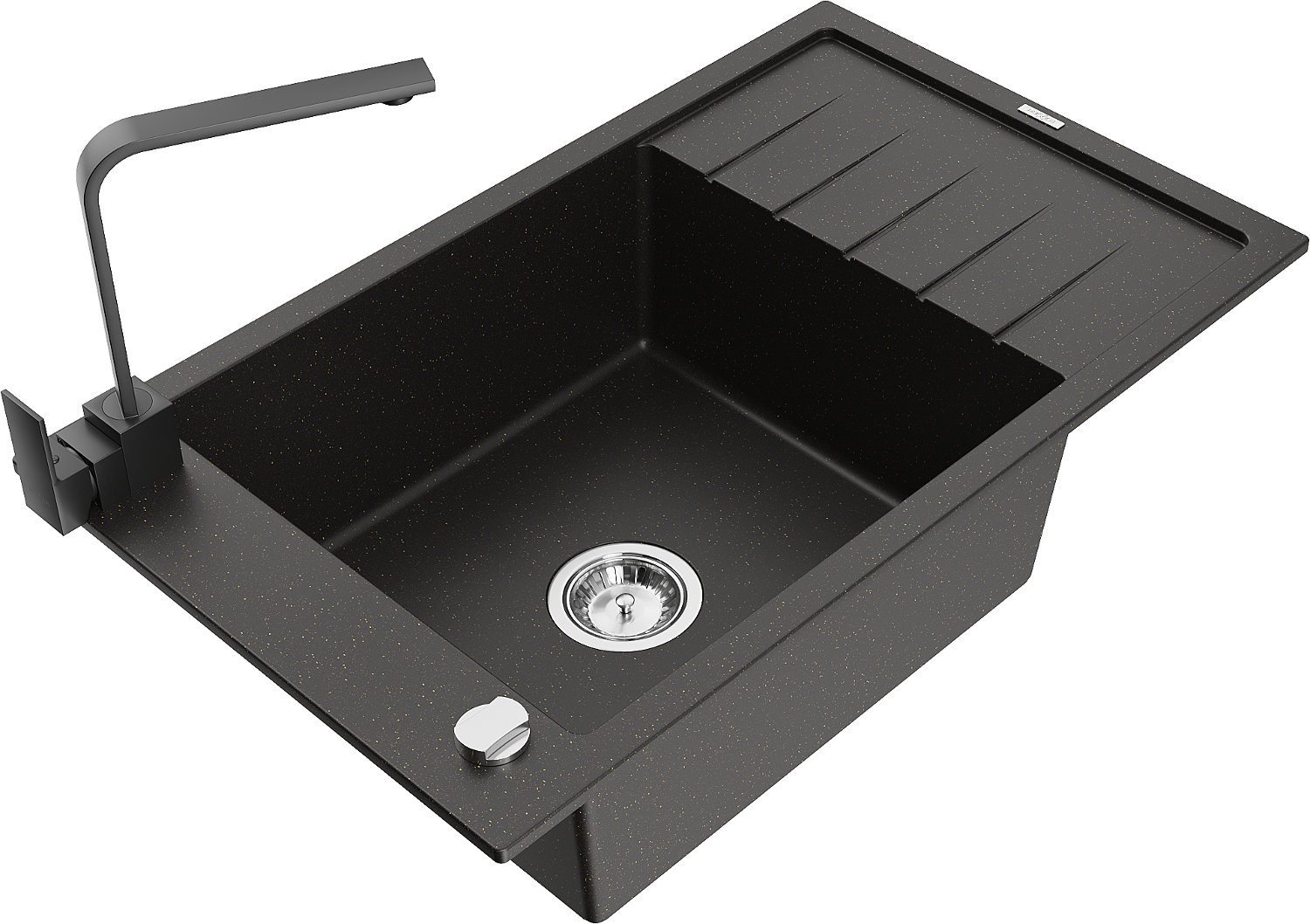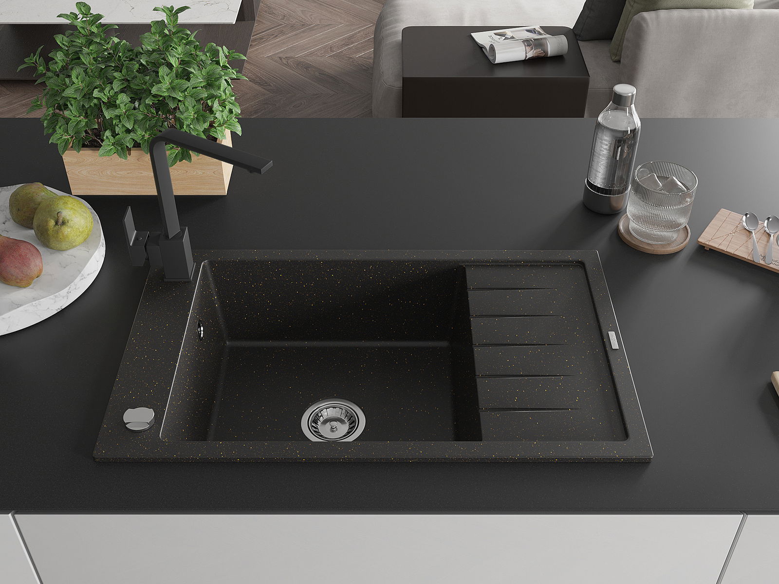 Mexen Elias 1-medencés gránit mosogató csepegtetővel és Rita konyhai csapteleppel, fekete/arany metál - 6511-75-670300-70