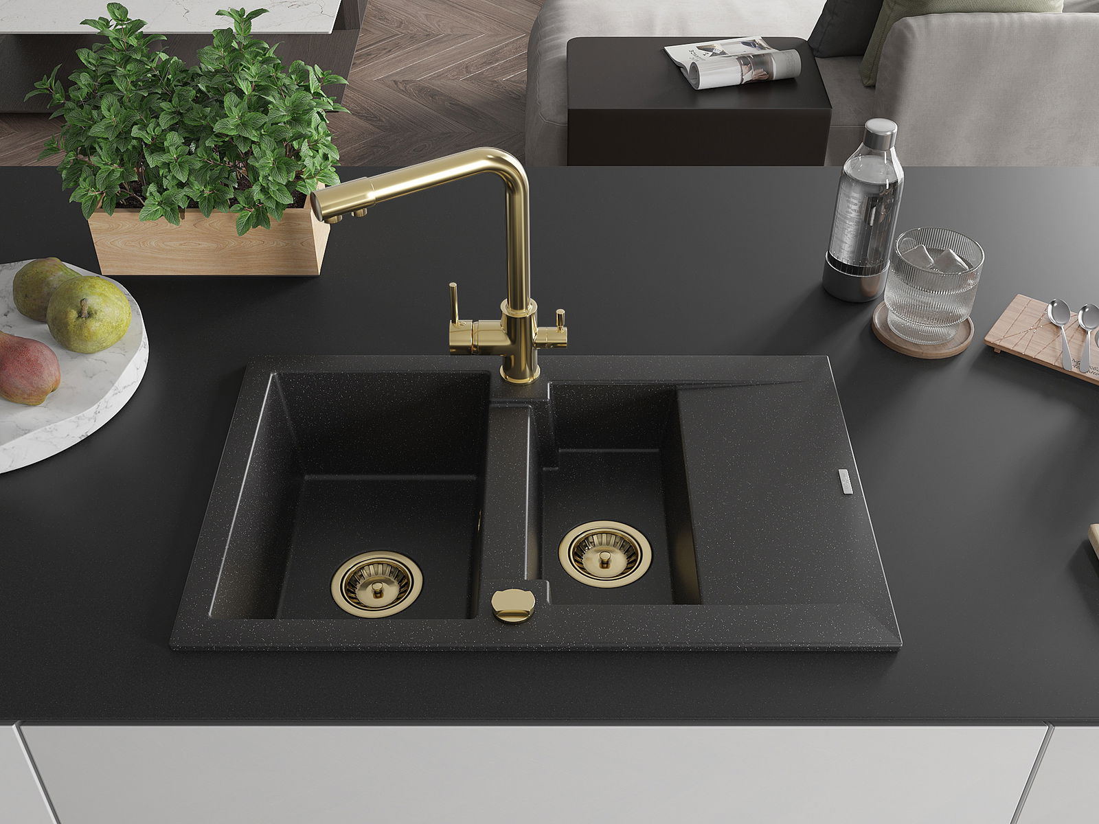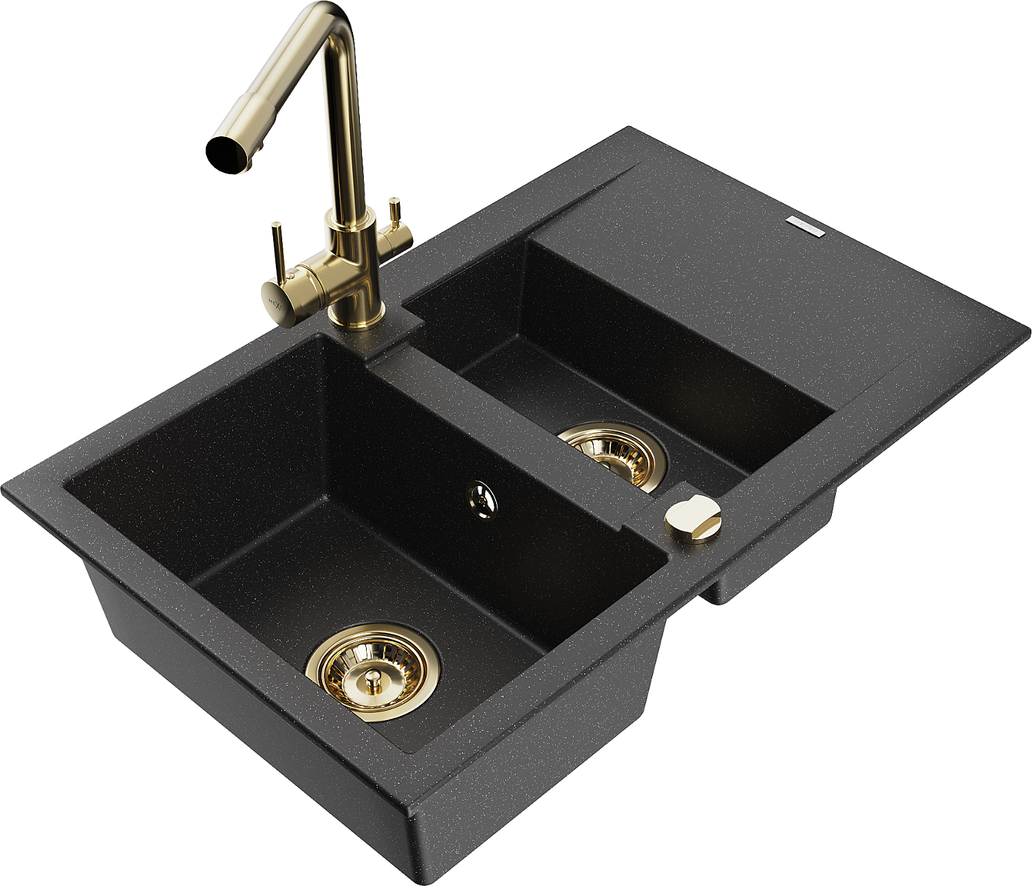 Mexen Gaspar gránit mosogató 1,5 medencés csepegtetővel és Duero konyhai csappal, fekete/ezüst - 6507-73-671600-50
