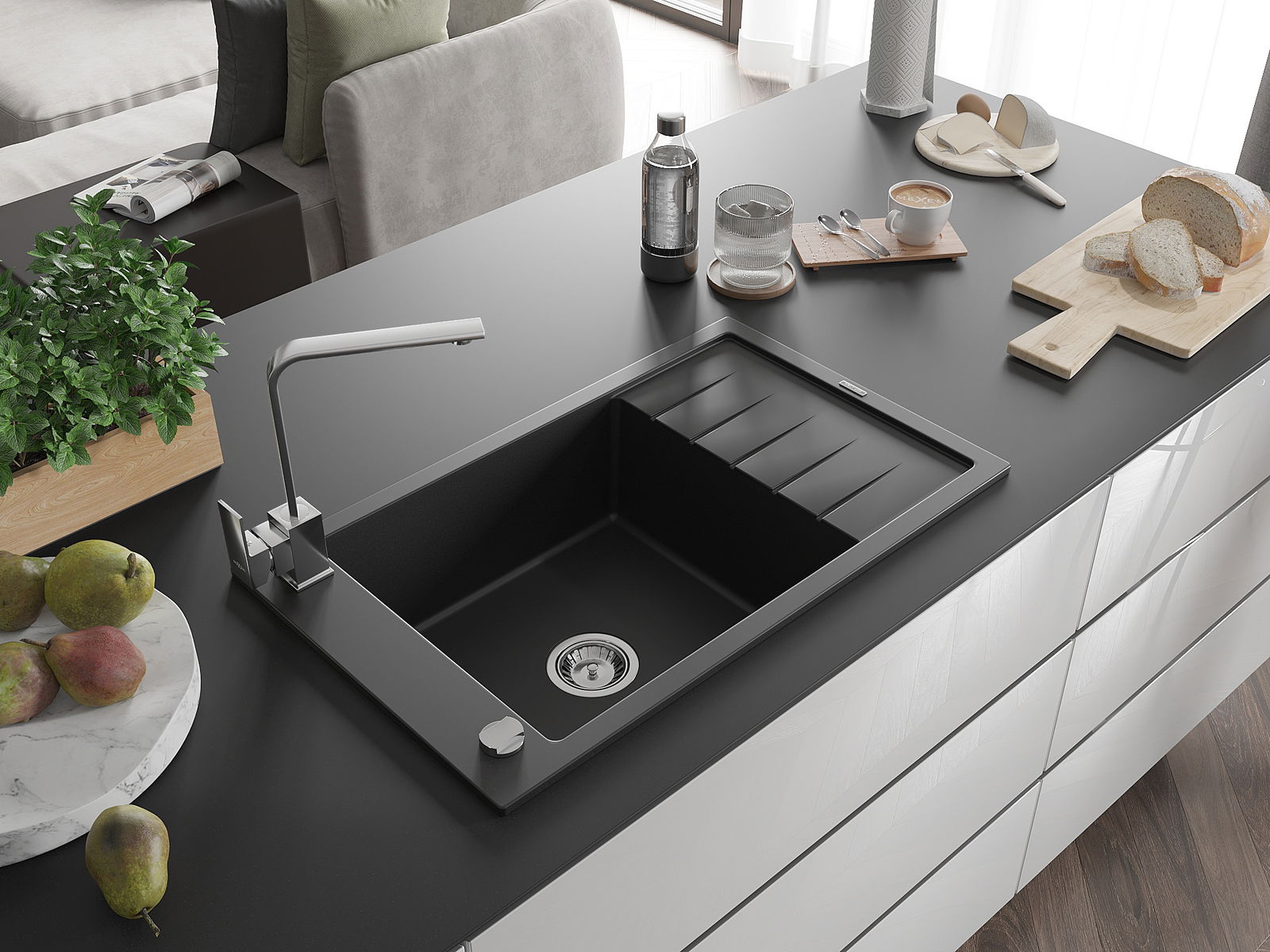 A mosogató kiváló minőségű gránitból készül. Ez egy elegáns és mindenekelőtt minden konyhához praktikus kiegészítés, stílusától függetlenül. A kiváló minőségű és a gránit tartósság biztosítja a sok éves használatát.