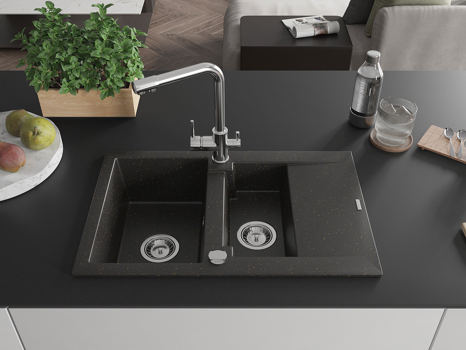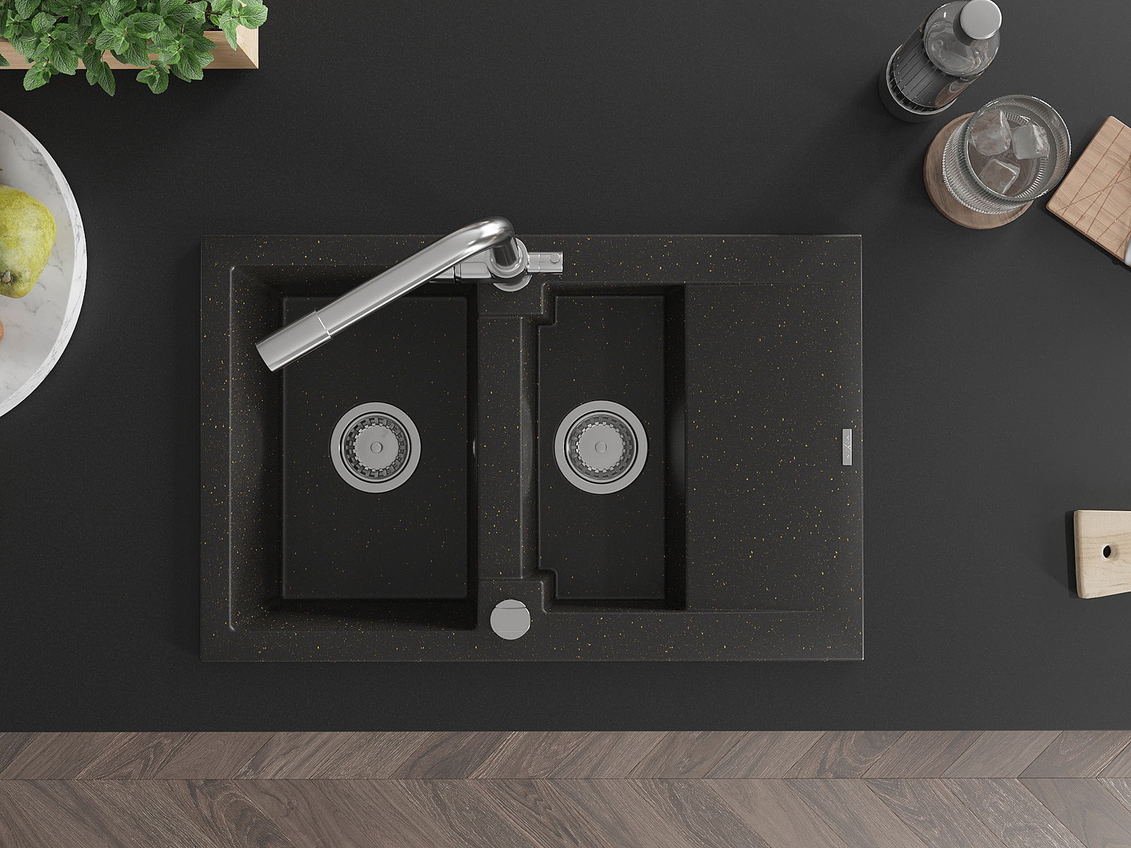 Mexen Gaspar 1,5-medencés gránit mosogató csepegtetővel és Duero konyhai csapteleppel, fekete/arany metál - 6507-75-671600-00