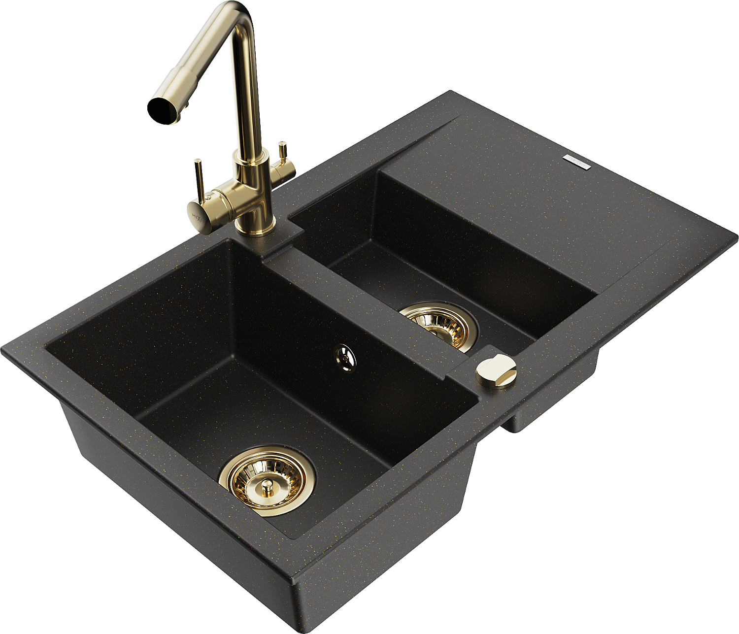 Mexen Gaspar 1,5-medencés gránit mosogató csepegtetővel és Duero konyhai csapteleppel, fekete/arany metál - 6507-75-671600-50