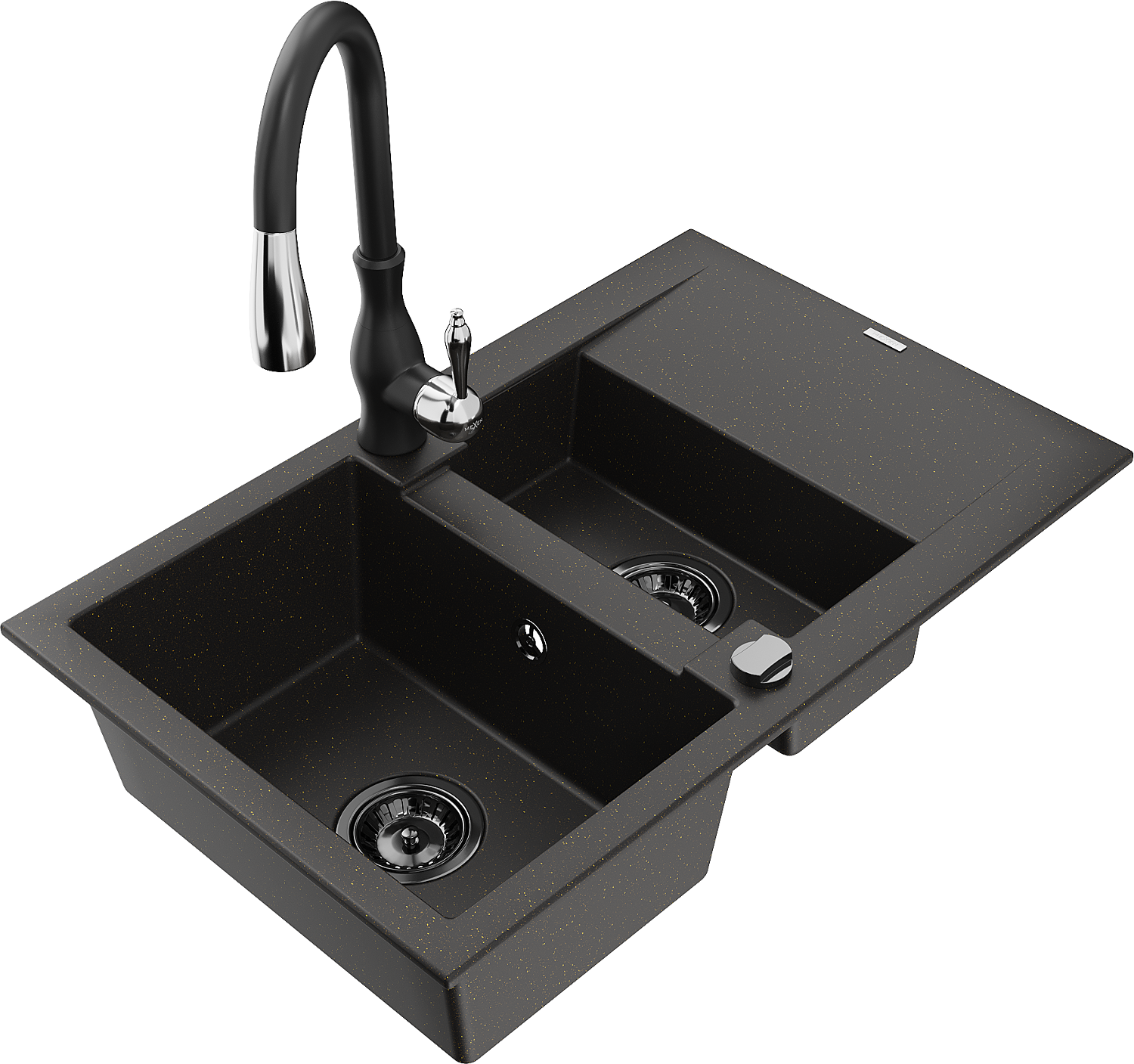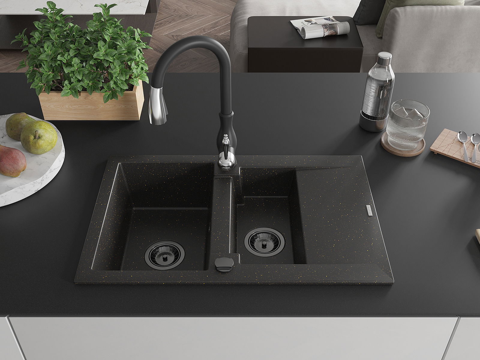 Mexen Gaspar gránit mosogató 1,5 kagylós, csepegtetővel és Savita konyhai csapteleppel, fekete/arany - 6507-75-672601-70-B