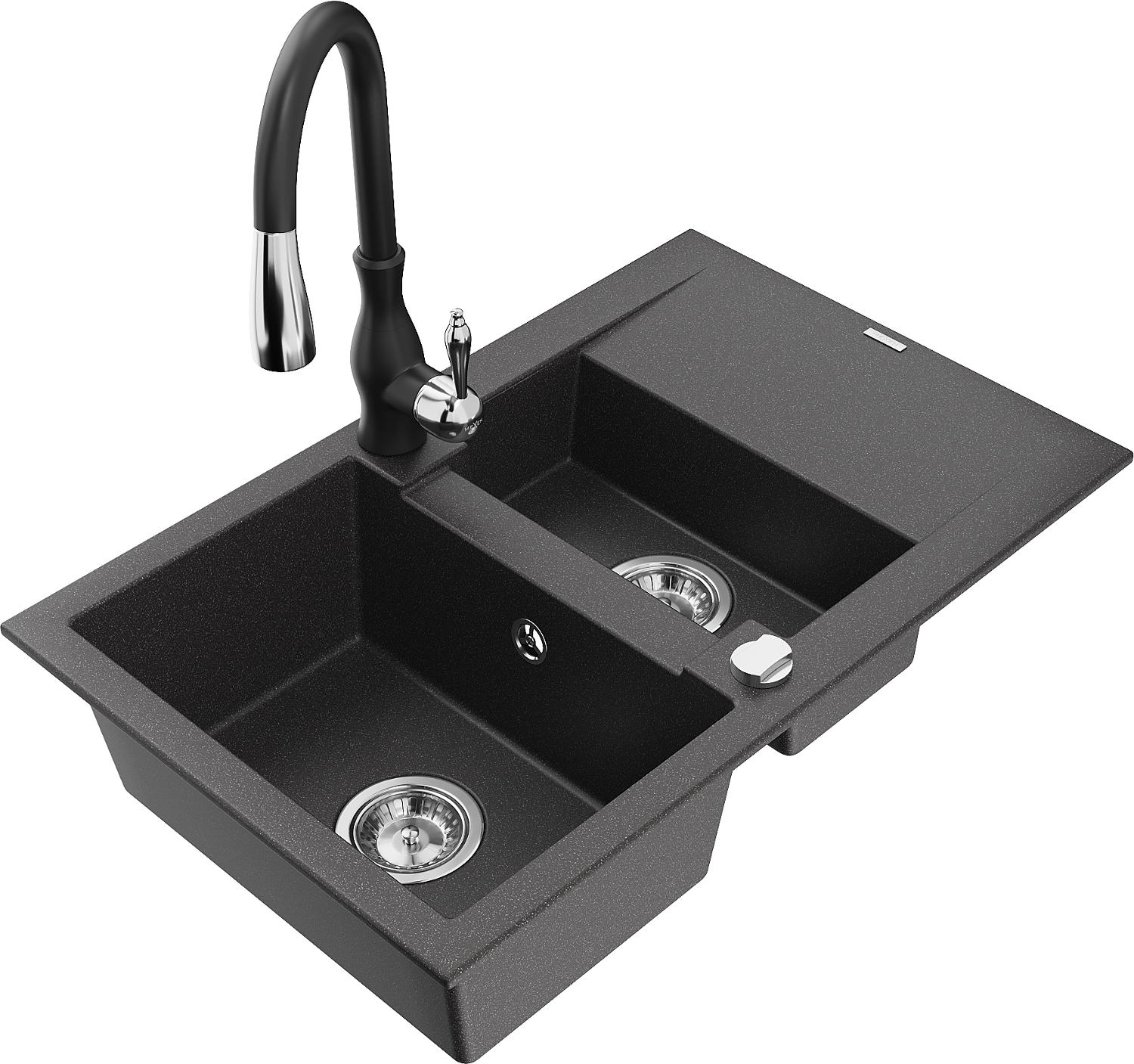 Mexen Gaspar 1,5-medencés gránit mosogató csepegtetővel és Savita konyhai csapteleppel, fekete pettyes - 6507-76-672601-70