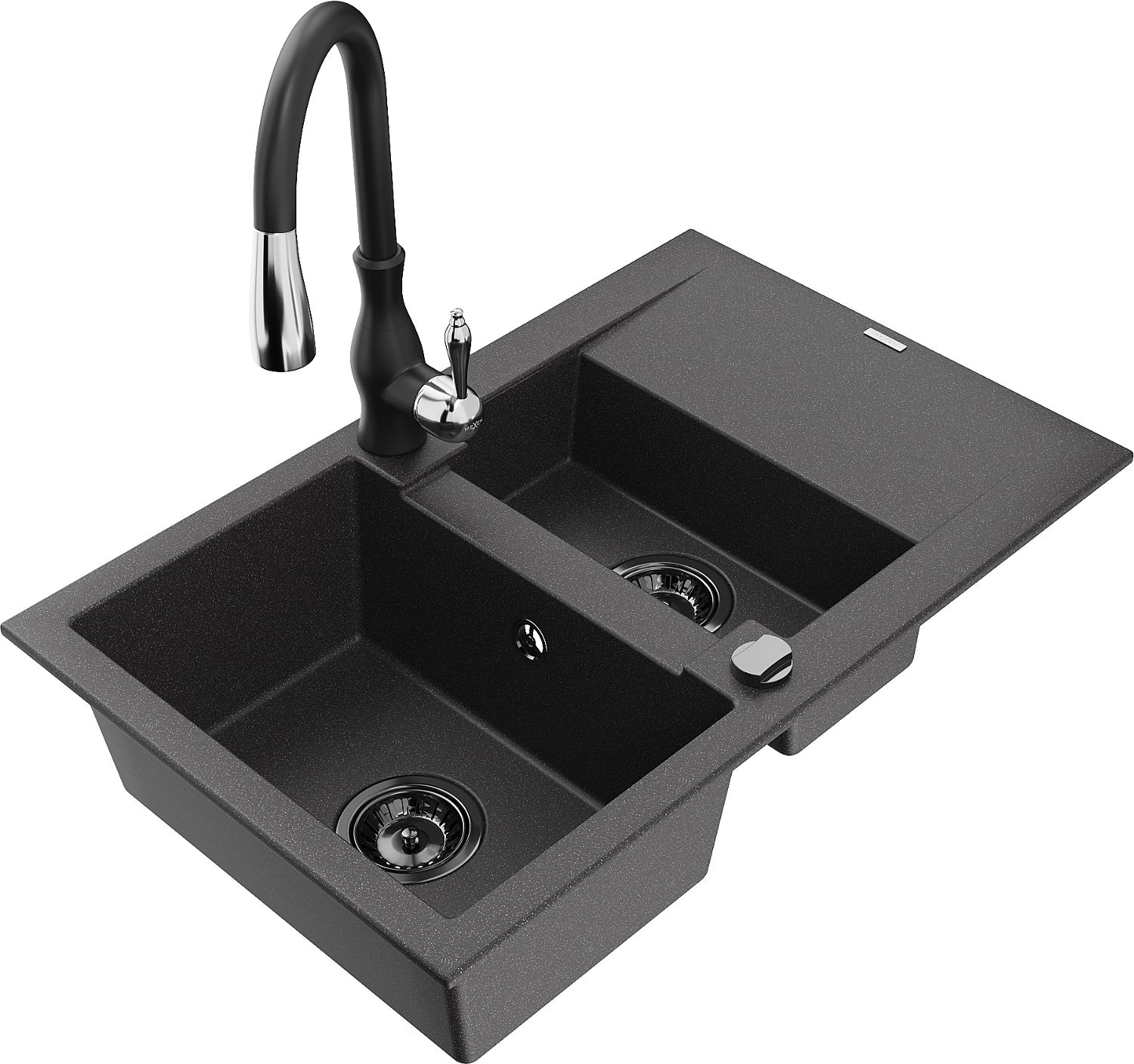 Mexen Gaspar 1,5 rekeszes gránit mosogató lefolyóval és Savita konyhai csappal, fekete pöttyös - 6507-76-672601-70-B