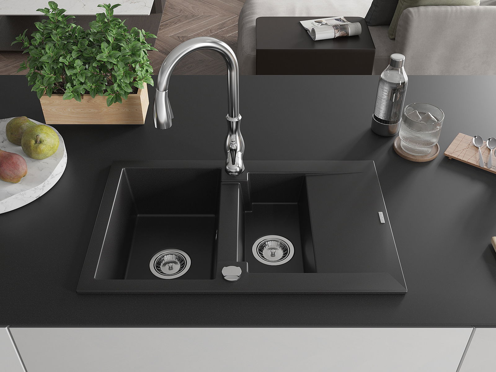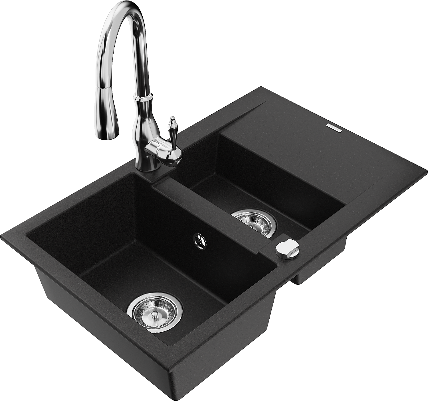 Mexen Gaspar 1,5 rekeszes gránit mosogató csepegtetővel és Savita konyhai csapteleppel, fekete - 6507-77-672601-00