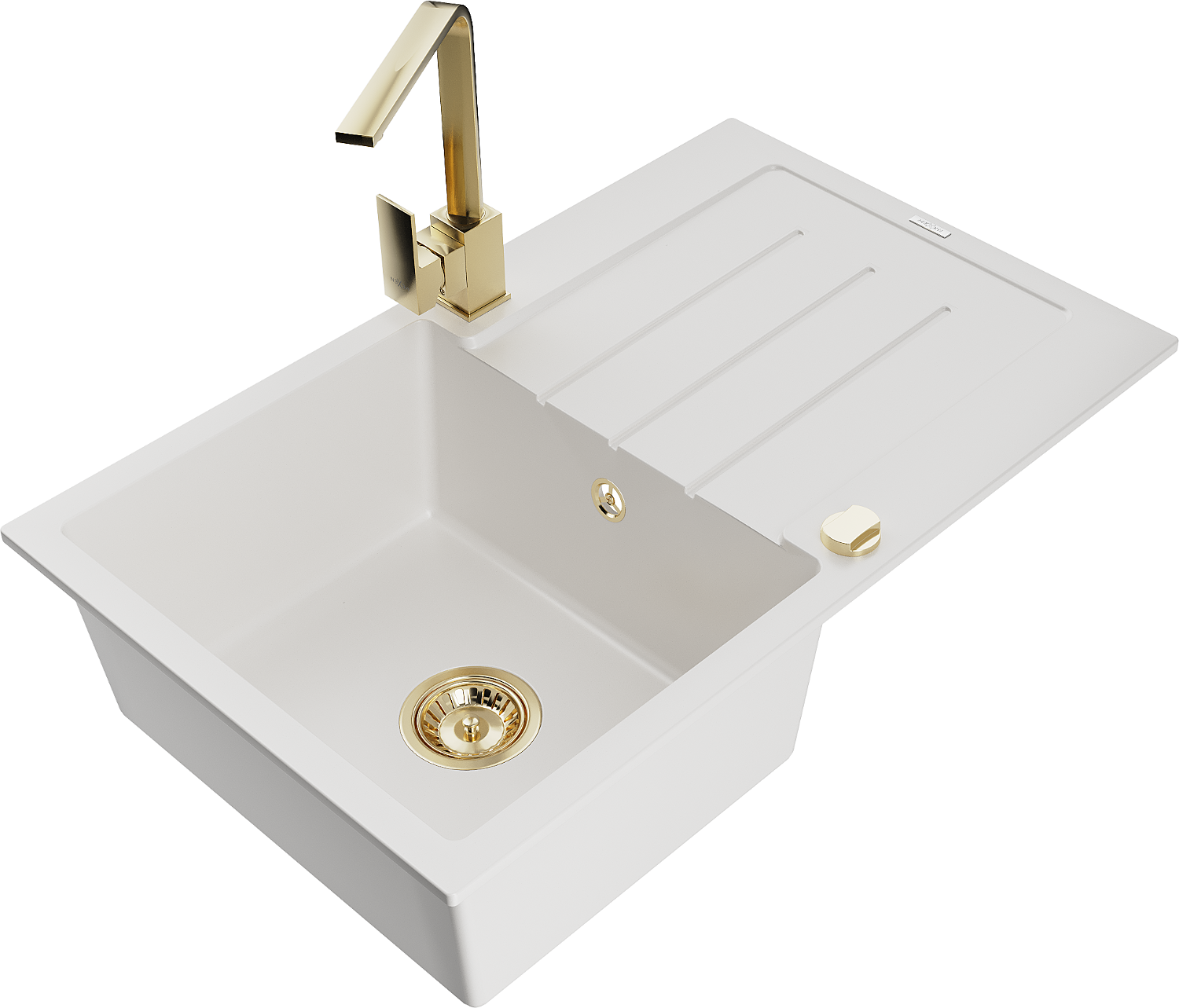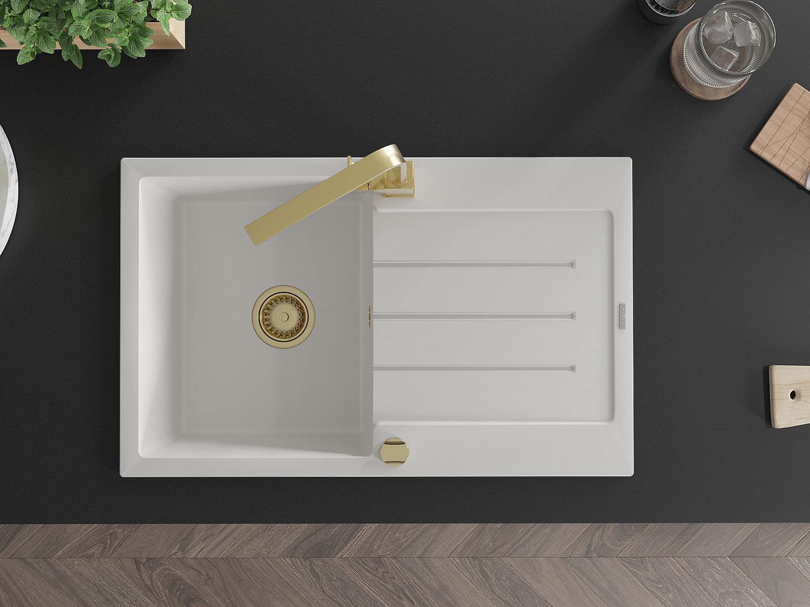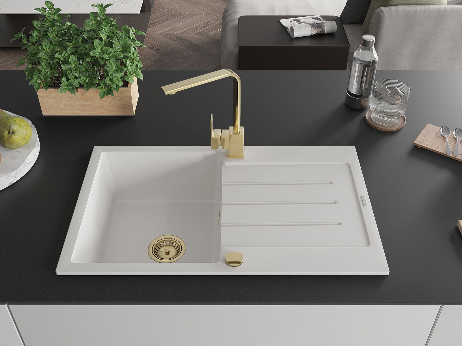 Mexen Bruno 1-medencés gránit mosogató csepegtetővel és Rita konyhai csapteleppel, fehér - 6513-20-670300-50