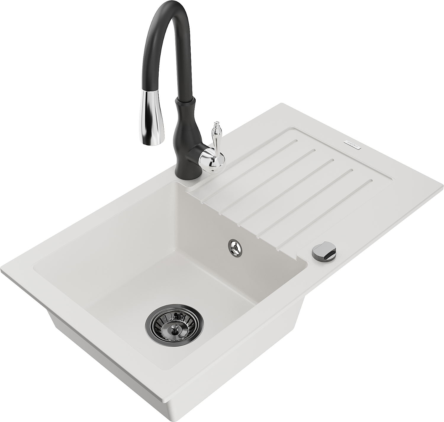 Mexen Pablo gránit konyhai mosogató 1-medencés csepegtetővel és Savita konyhai csapteleppel, fehér - 6510-20-672601-70