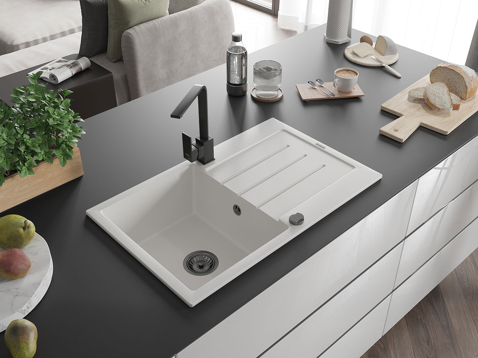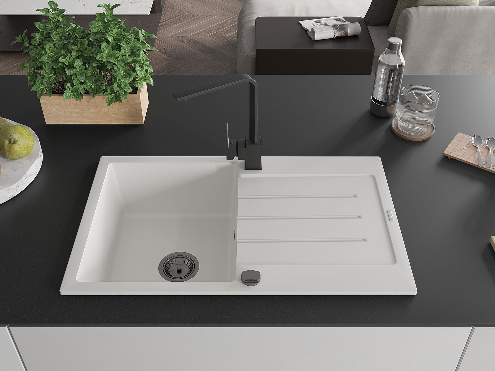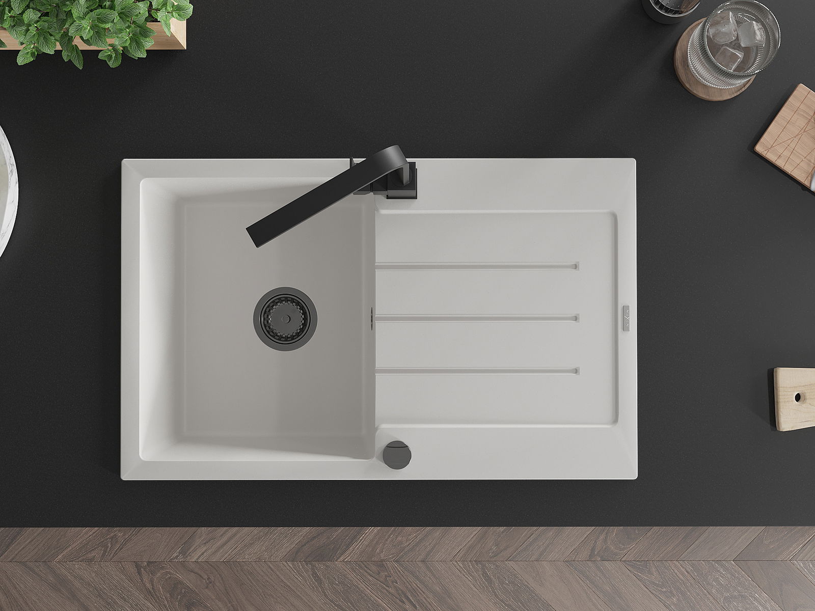 A mosogató magas minőségű gránitból készült. Elegáns, de mindenekelőtt praktikus kiegészítője minden konyhának, függetlenül annak stílusától. A gránit magas minősége és tartóssága hosszú távú használatot biztosít.