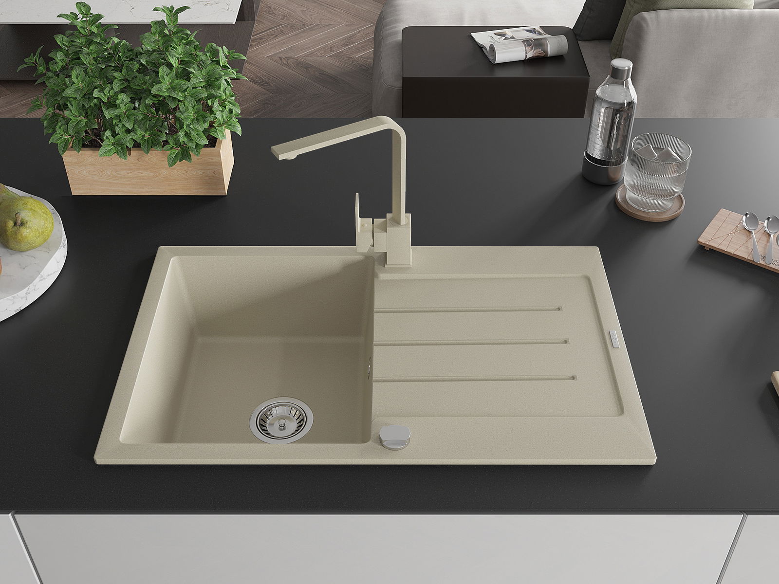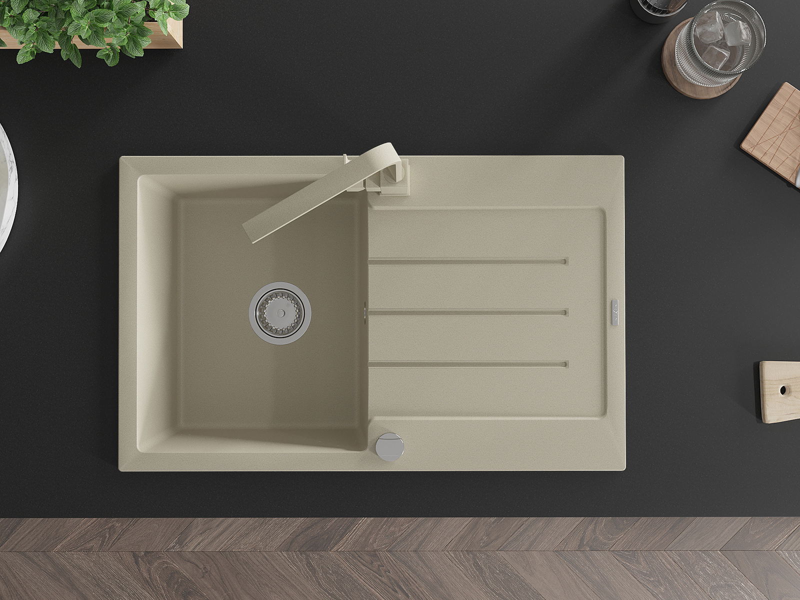 A mosogató kiváló minőségű gránitból készül. Ez egy elegáns és mindenekelőtt minden konyhához praktikus kiegészítés, stílusától függetlenül. A kiváló minőségű és a gránit tartósság biztosítja a sok éves használatát.