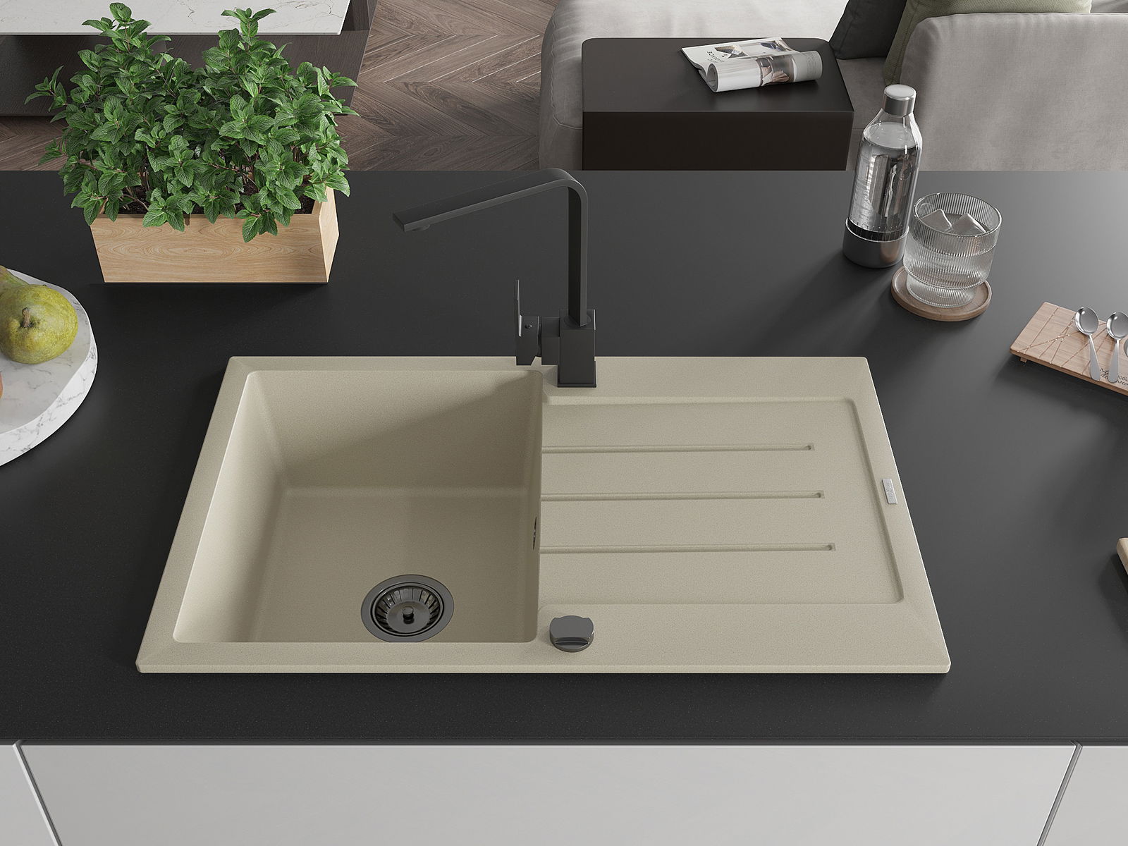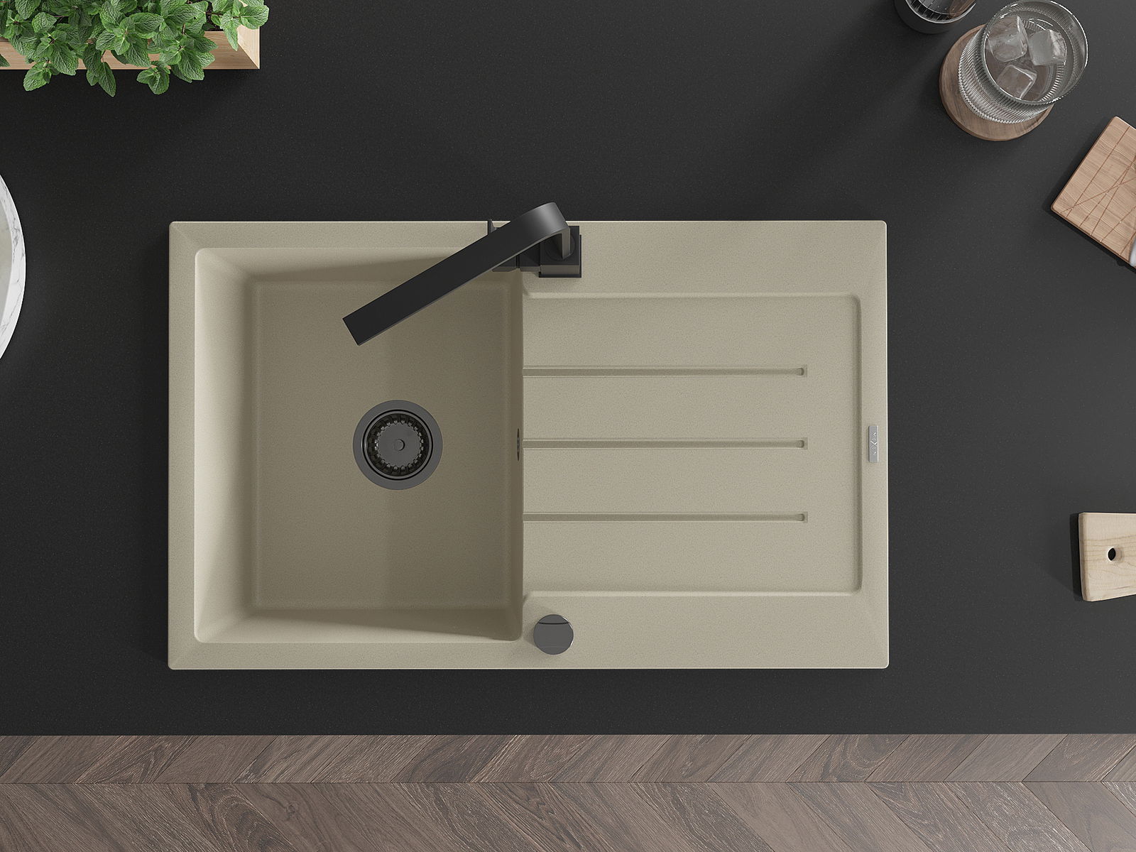 A mosogató kiváló minőségű gránitból készül. Ez egy elegáns és mindenekelőtt minden konyhához praktikus kiegészítés, stílusától függetlenül. A kiváló minőségű és a gránit tartósság biztosítja a sok éves használatát.