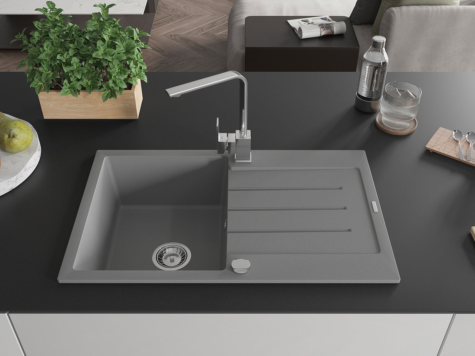 A mosogató magas minőségű gránitból készült. Elegáns, de mindenekelőtt praktikus kiegészítője minden konyhának, függetlenül annak stílusától. A gránit magas minősége és tartóssága hosszú távú használatot biztosít.