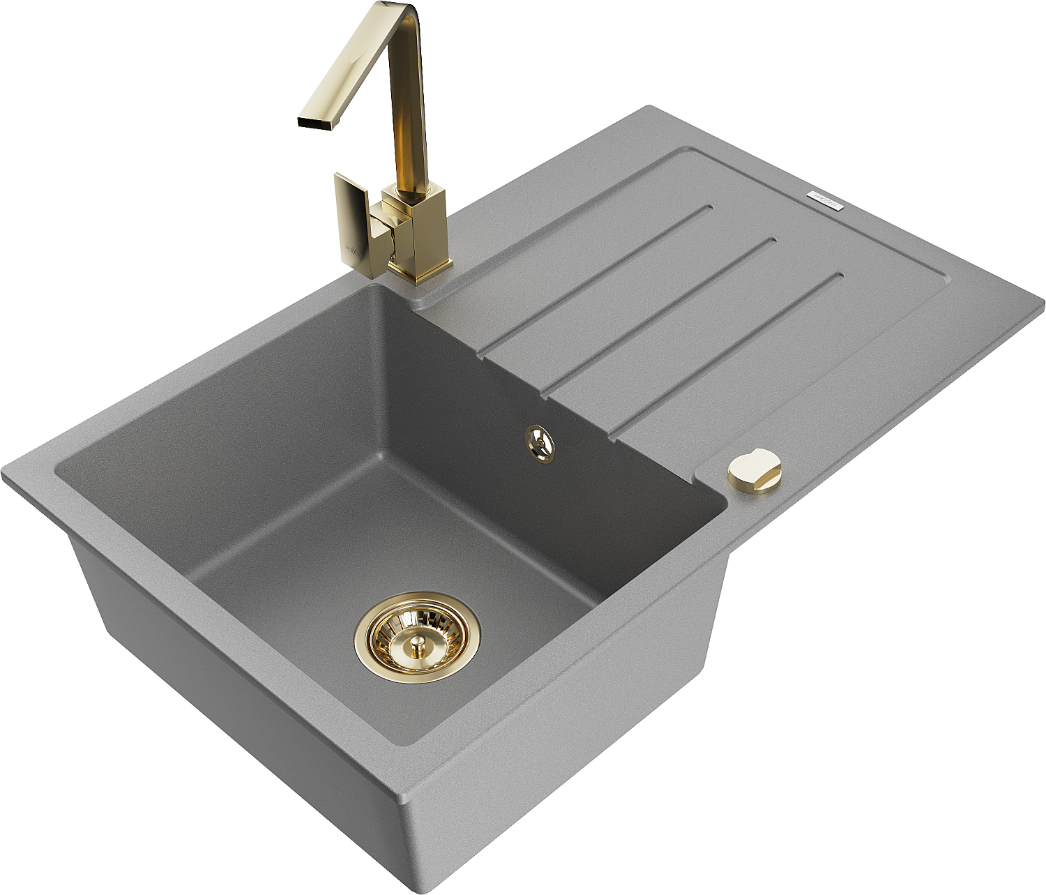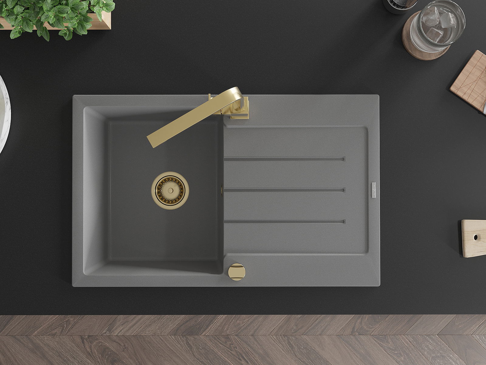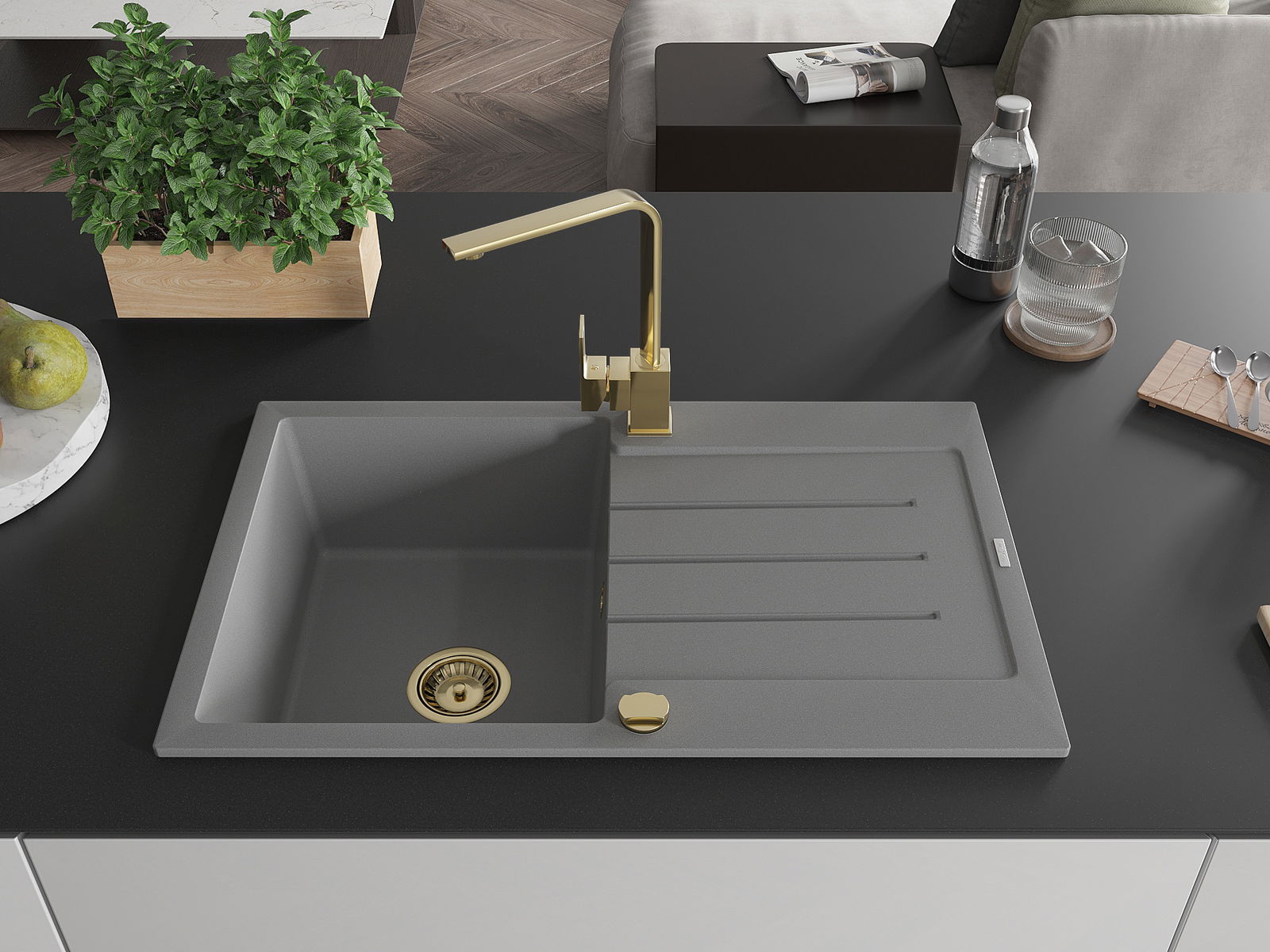 Mexen Bruno egymedencés gránit mosogató csepegtetővel és Rita konyhai csapteleppel, szürke - 6513-71-670300-50