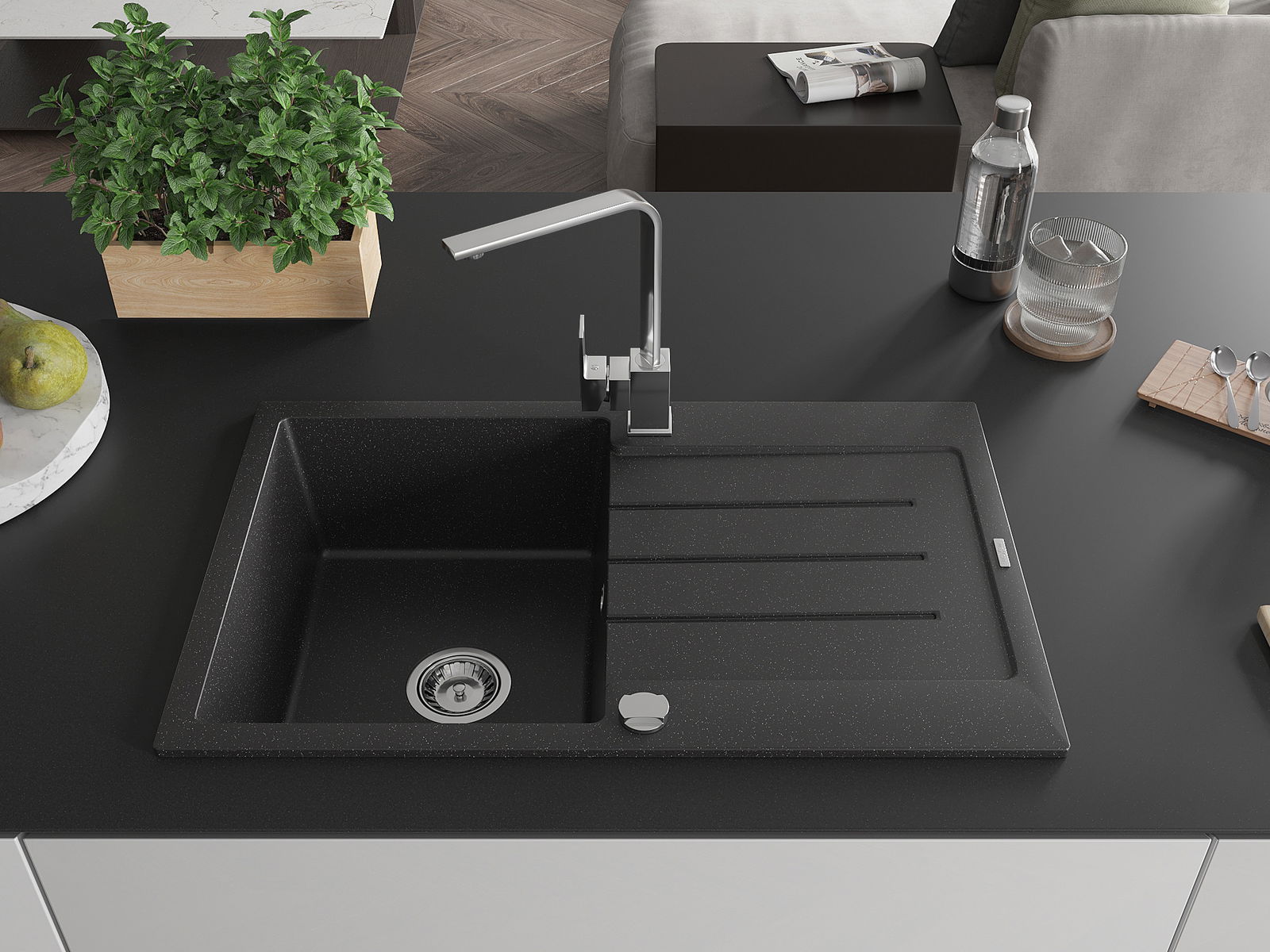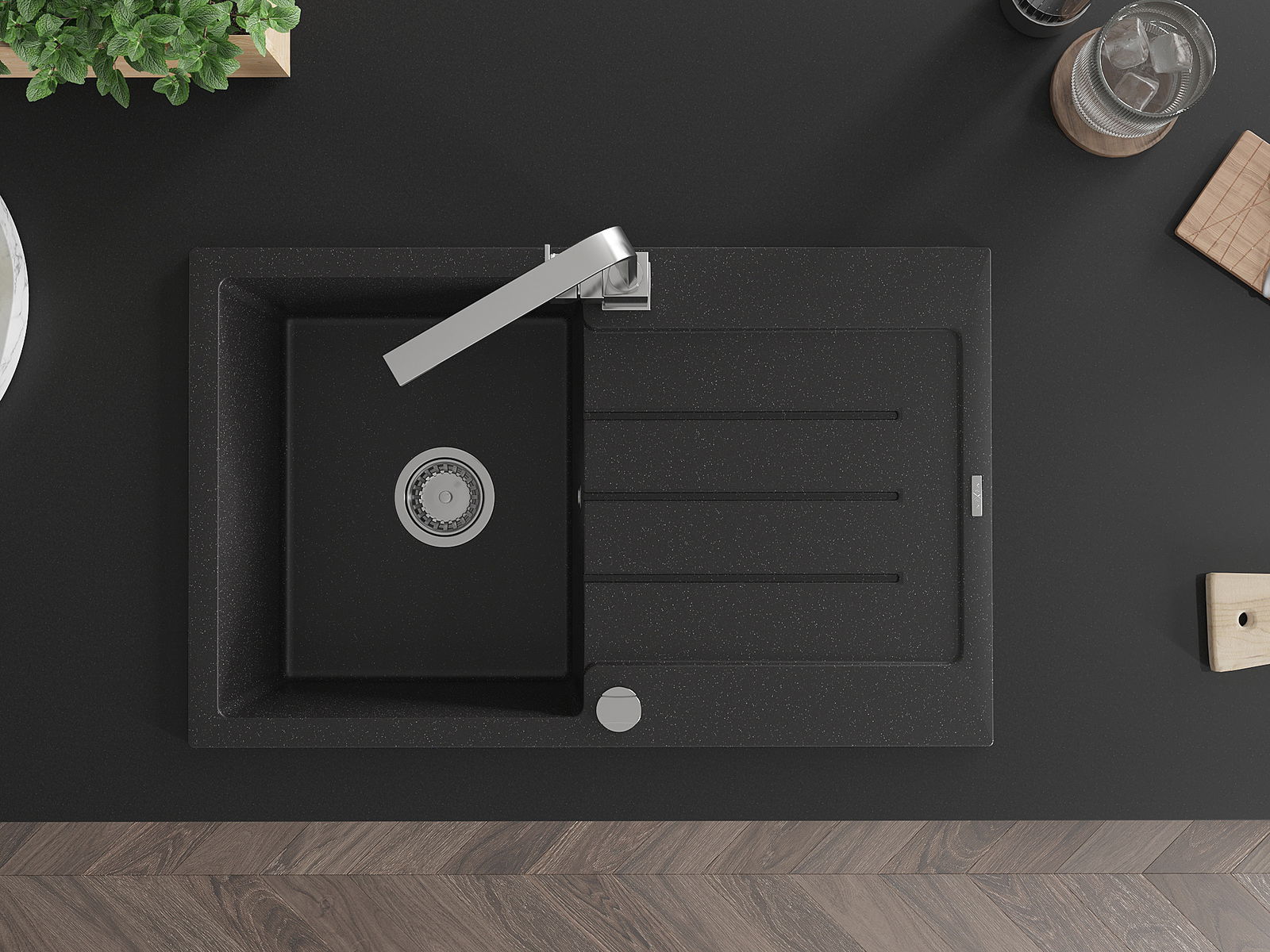 Mexen Bruno 1-kamrás gránit mosogató csepegtetővel és Rita konyhai csapteleppel, fekete/ezüst metál - 6513-73-670300-00