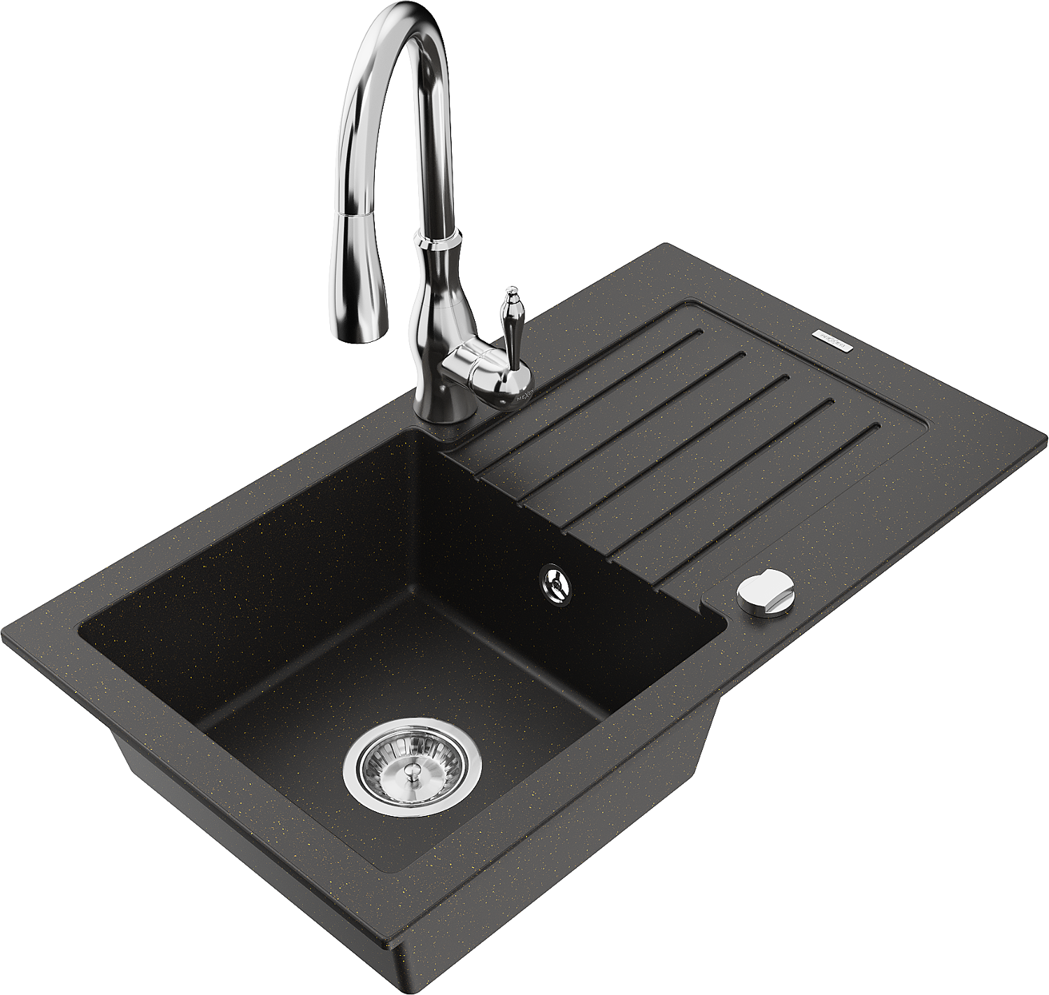 Mexen Pablo egymedencés gránit mosogató csepegtetővel és Savita konyhai csapteleppel, fekete/arany metál - 6510-75-672601-00
