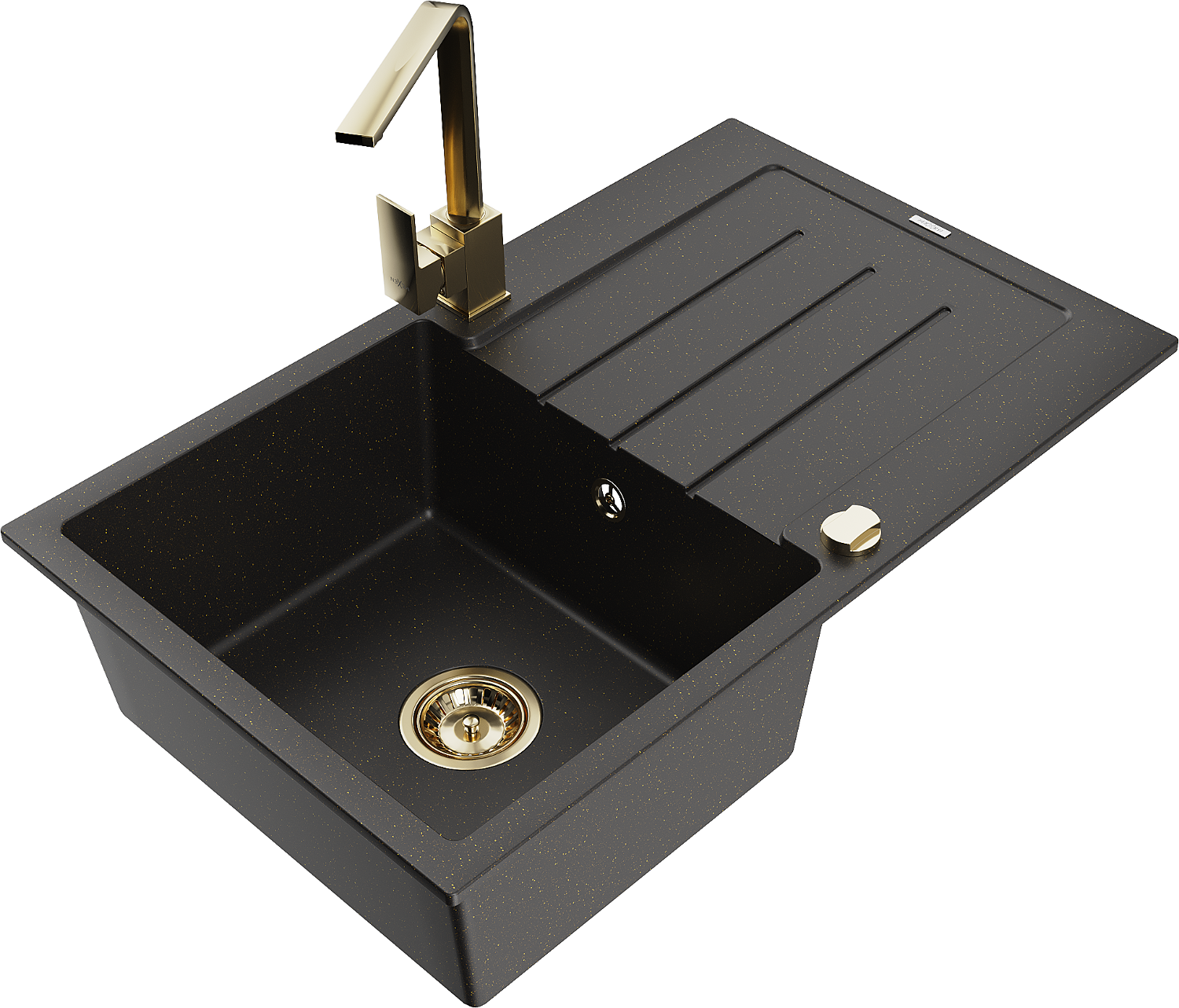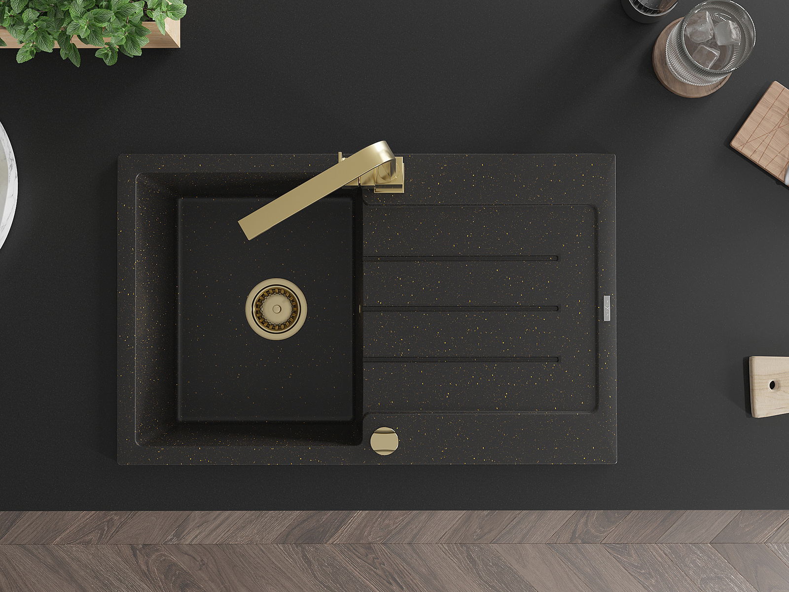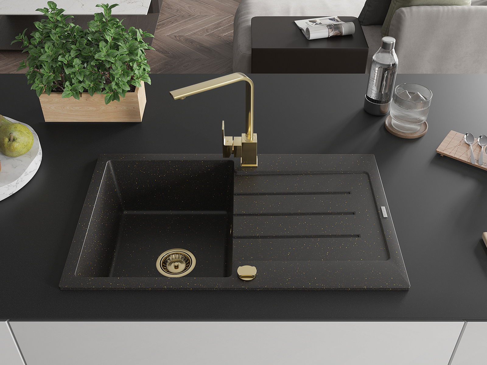 Mexen Bruno egymedencés gránit mosogató csepegtetővel és Rita konyhai csappal, fekete/arany metál - 6513-75-670300-50
