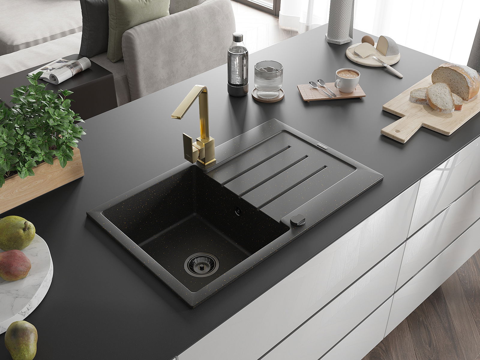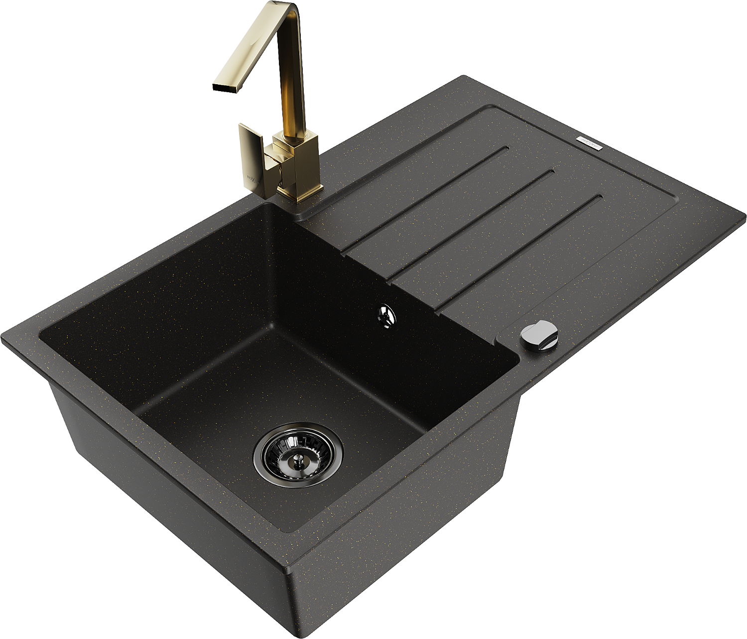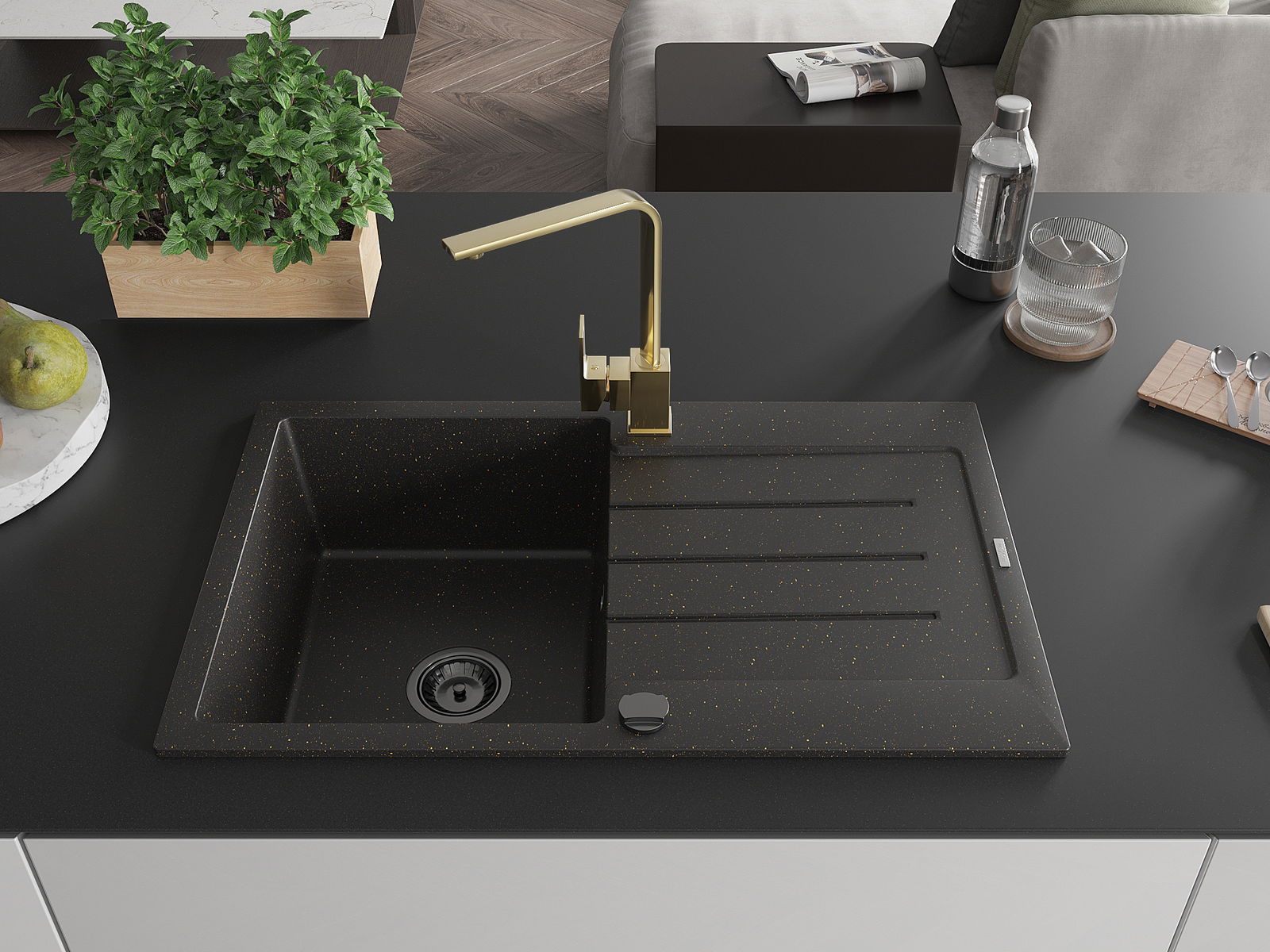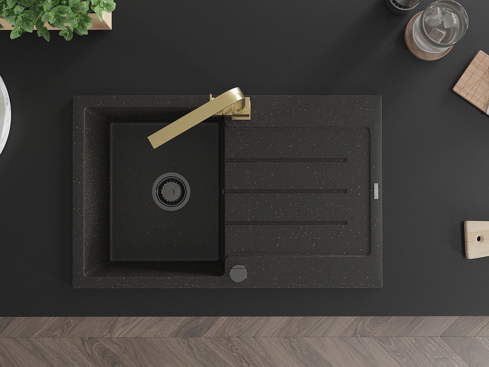 Mexen Bruno 1-medencés gránit mosogató csepegtetővel és Rita konyhai csapteleppel, fekete/arany metál - 6513-75-670300-50-B
