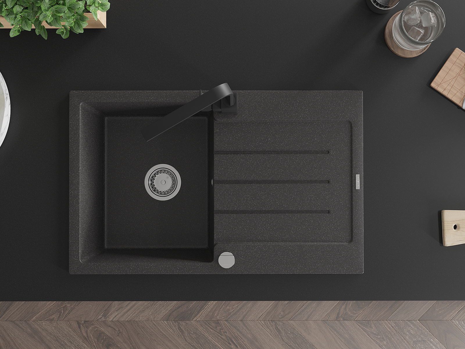 A mosogató kiváló minőségű gránitból készül. Ez egy elegáns és mindenekelőtt minden konyhához praktikus kiegészítés, stílusától függetlenül. A kiváló minőségű és a gránit tartósság biztosítja a sok éves használatát.