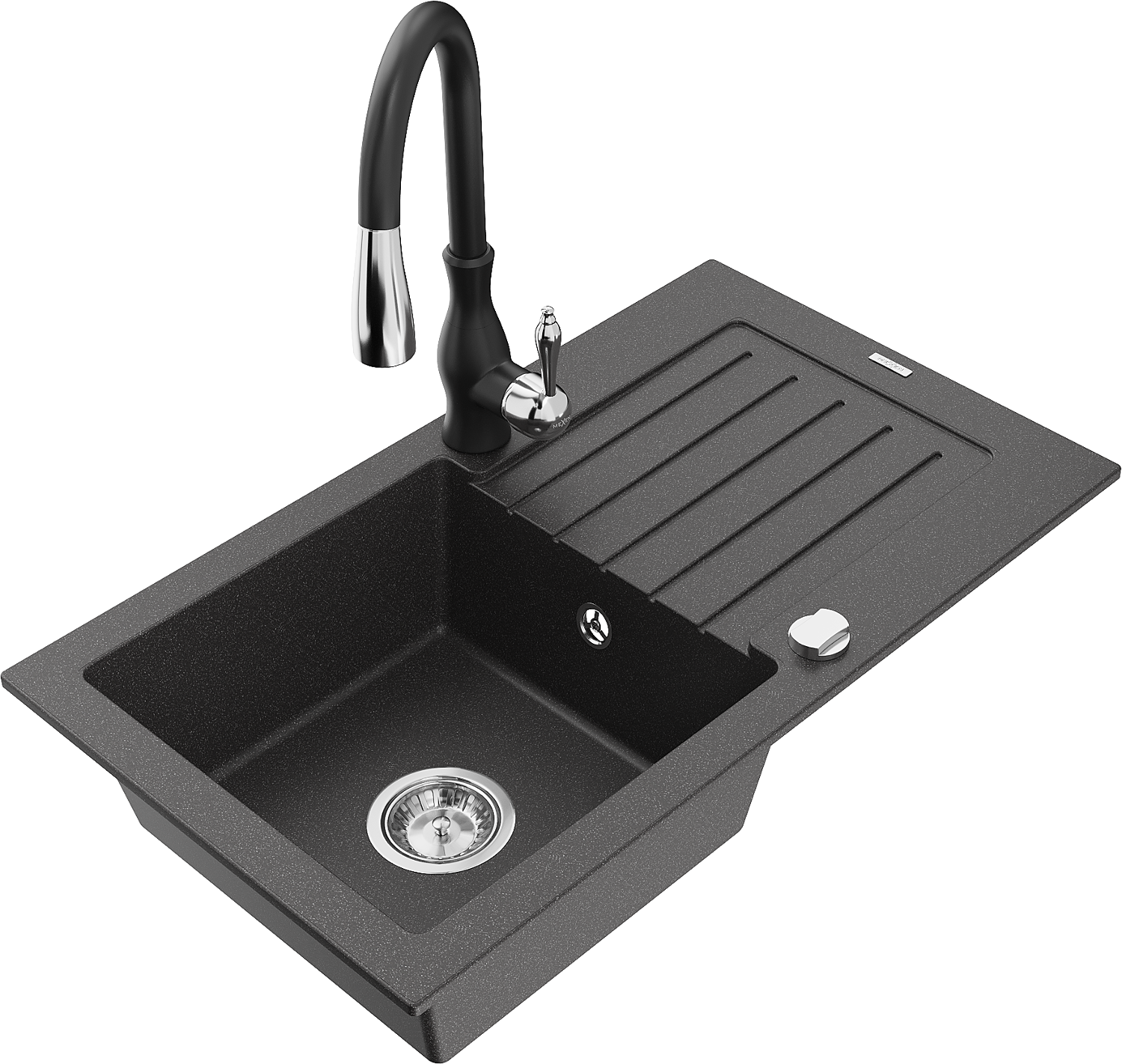 Mexen Pablo gránit mosogató 1-medencés csepegtetővel és Savita konyhai csapteleppel, fekete pöttyös - 6510-76-672601-70