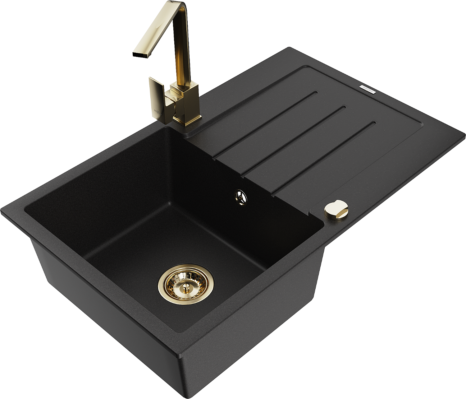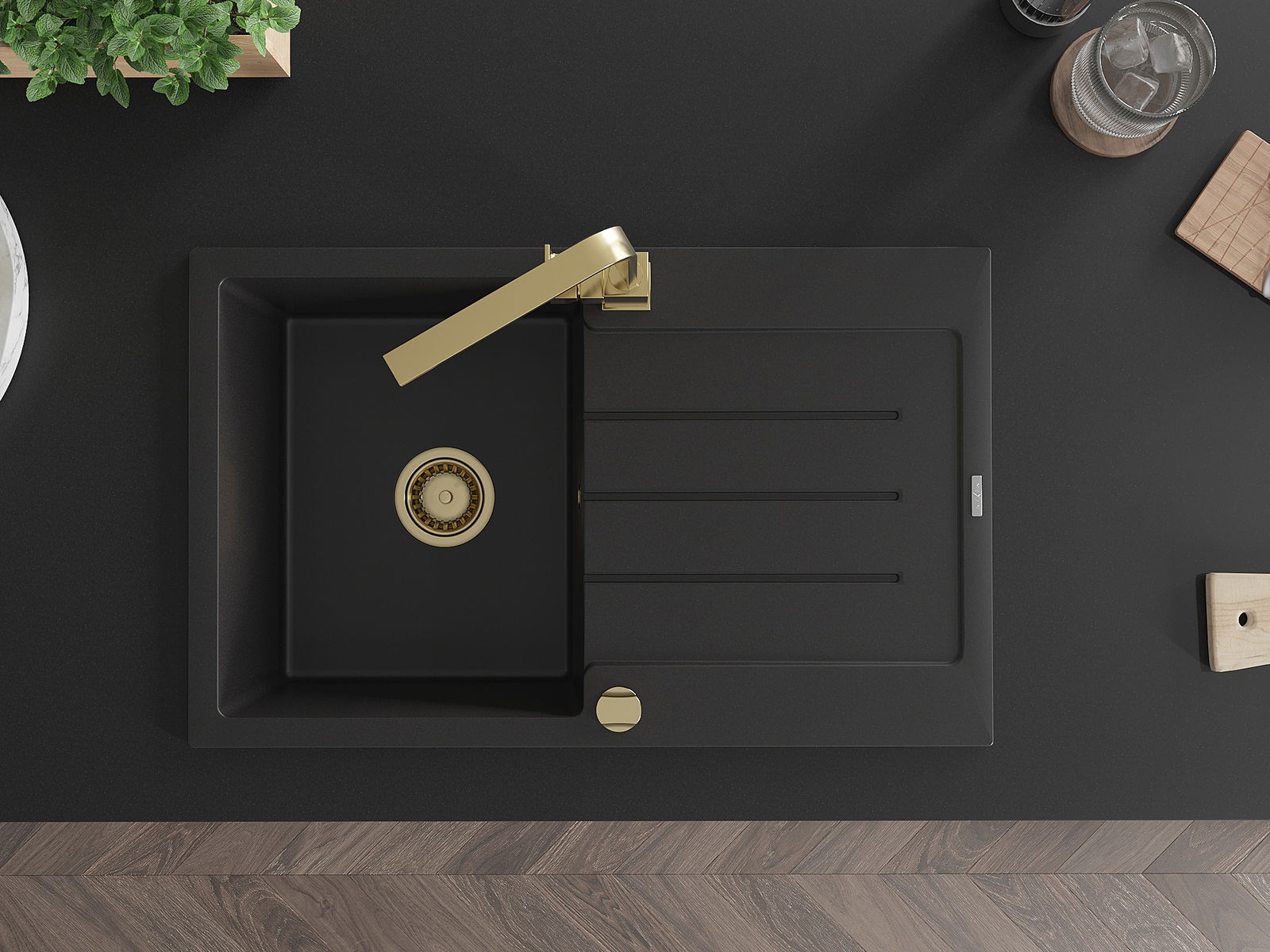 Mexen Bruno 1-medencés gránit mosogató csepegtetővel és Rita konyhai csapteleppel, fekete - 6513-77-670300-50