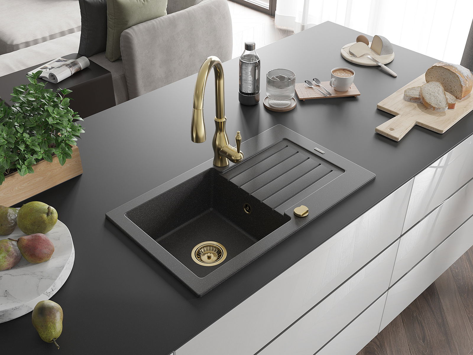 A mosogató kiváló minőségű gránitból készül. Ez egy elegáns és mindenekelőtt minden konyhához praktikus kiegészítés, stílusától függetlenül. A kiváló minőségű és a gránit tartósság biztosítja a sok éves használatát.