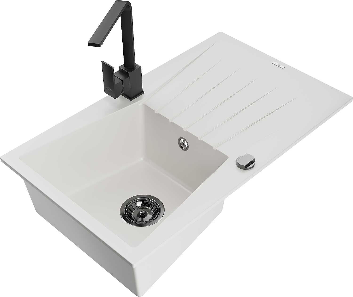 Mexen Cesar egymedencés gránit mosogató csepegtetővel és Rita konyhai csapteleppel, fehér - 6514-20-670300-70